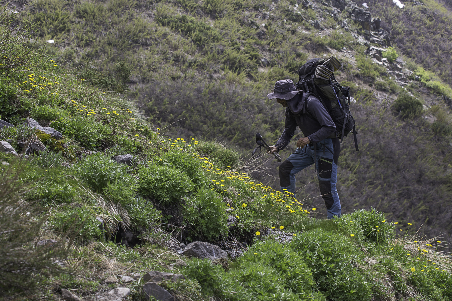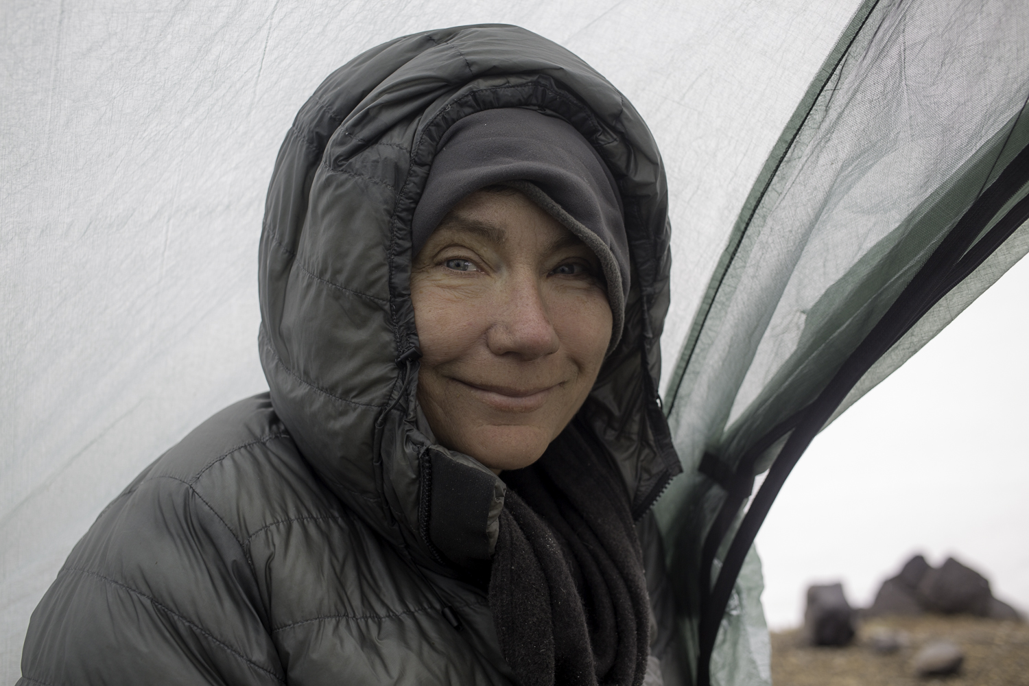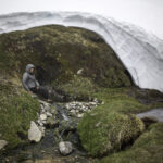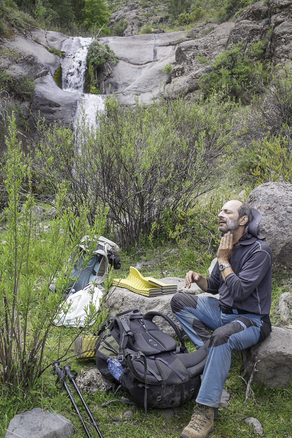 Schodzę aż zobaczę miejsce bez śniegu. Na suchszej górce ktoś wybudował kamienny płot. Wciskamy za nim namioty. Schodzę do potoku po wodę. Jest gorąca. Zimna wypływa z zaspy kilka metrów z boku. Co za luksus!