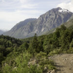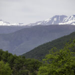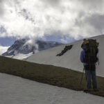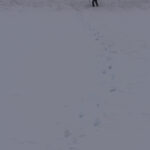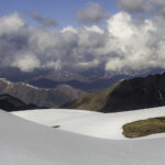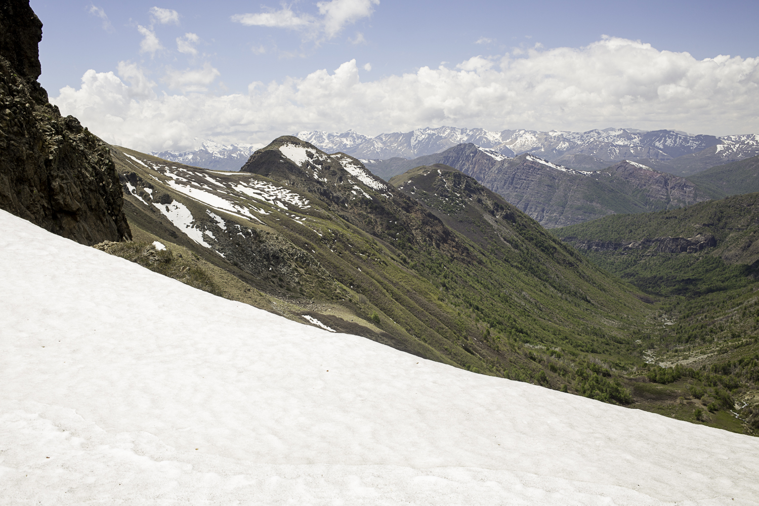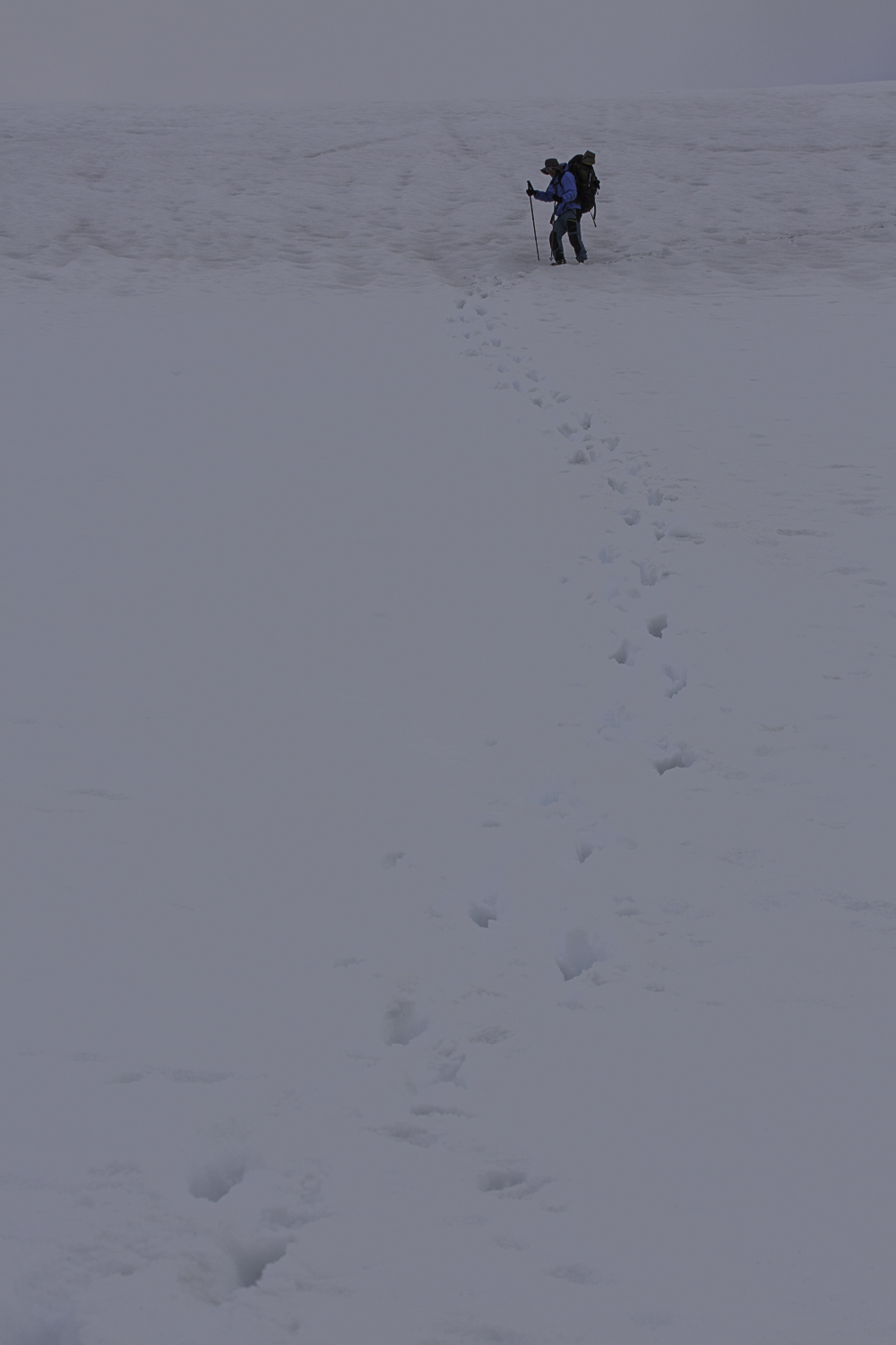 Wędrujemy po białych wzgórzach pod ogromnymi nawisami. Daleko od świeżych lawinisk. Nie bardzo wiem czy dobrze aż na śniegu zarysuje się stary ślad. Narciarz? Dwóch narciarzy, zatoczyli koło i wrócili w dół. Teraz idziemy po ich śladach, choć bez nart lepiej chyba by było inaczej. Jest grząsko. Na horyzoncie rysuje się łańcuch suchych gór. „To nimi przeszliśmy kiedyś z Jagodą” myślę i wspominam wspaniałą gorącą rzekę, przy której wtedy zabiwakowałyśmy wśród zieleni. Tylko wtedy już zbliżał się grudzień, a teraz mamy listopad.