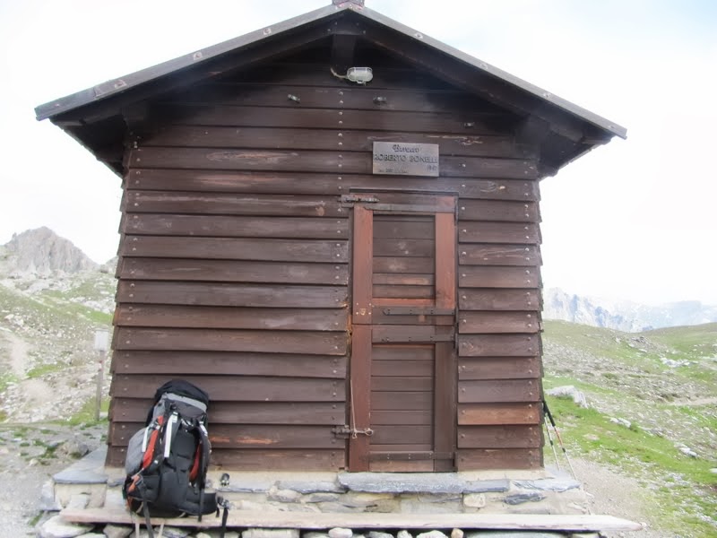 Do sklepu (w Acceglio) było 8 km więc uznaliśmy, że to co mamy wystarczy i wystartowaliśmy w górę (ale na początku trochę w dół) do najniżej położonego z okolicznych biwaków (Bivacco Bonelli). Było po piątej i wyraźnie się chmurzyło, drogowskaz pokazywał 3,5 godziny. Gdyby ktoś z Was miał ochotę powtórzyć tę trasę, warto trzymać się niebiesko czerwonych znaków SRC, inne są zagmatwane i pogubiliśmy się kilkukrotnie ostatecznie wdrapując się nad jeziorko Visaisa bez szlaku po obsuwających się piargach.