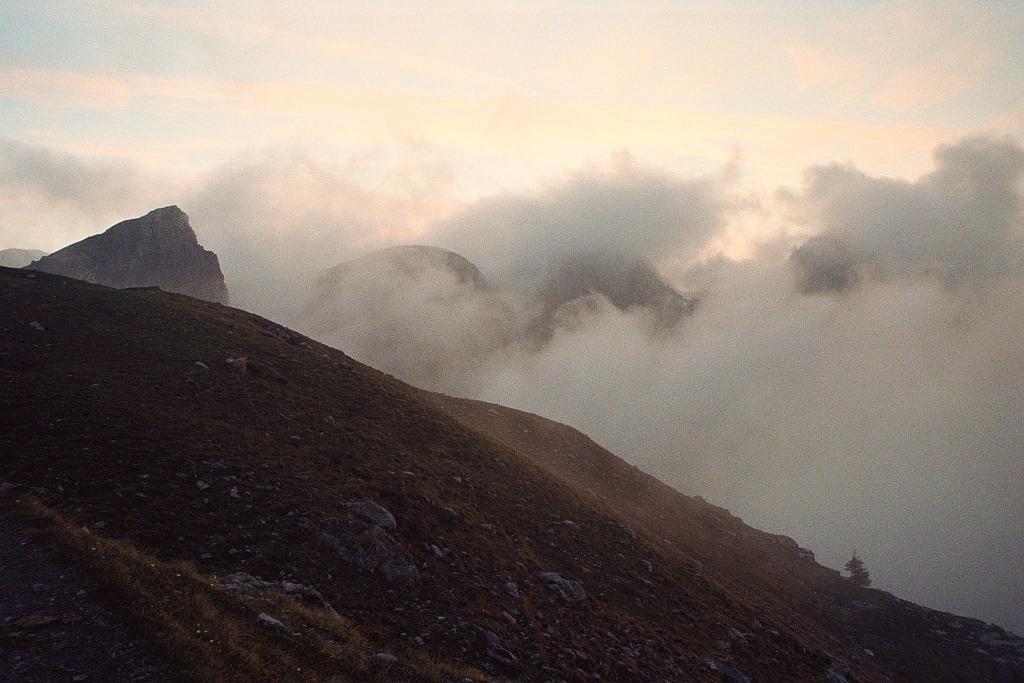 Dziwne, bo to fragment gta (wielkiego trawersu Alp). Różnorodnych znaków i drogowskazów jest mnóstwo. Nie ma jednak logiki i zgodności z mapą, więc efekt jest z lekka żałosny. Od drogi trawersującej stok oznakowanie się nieco poprawia, więc nie przeszkadzała nam nawet całkiem nieprzezroczysta mgła.