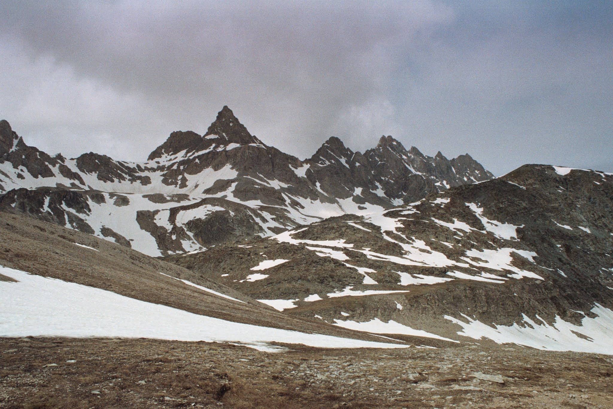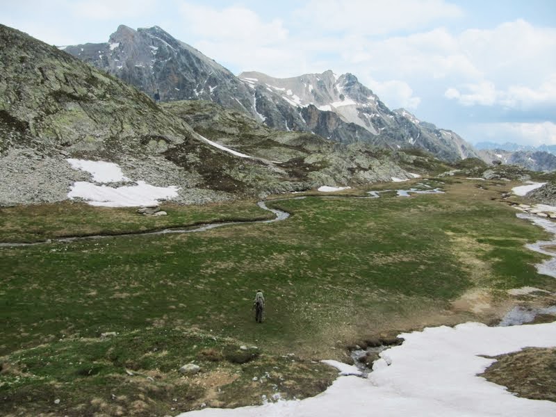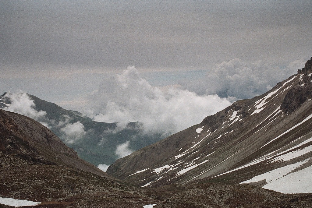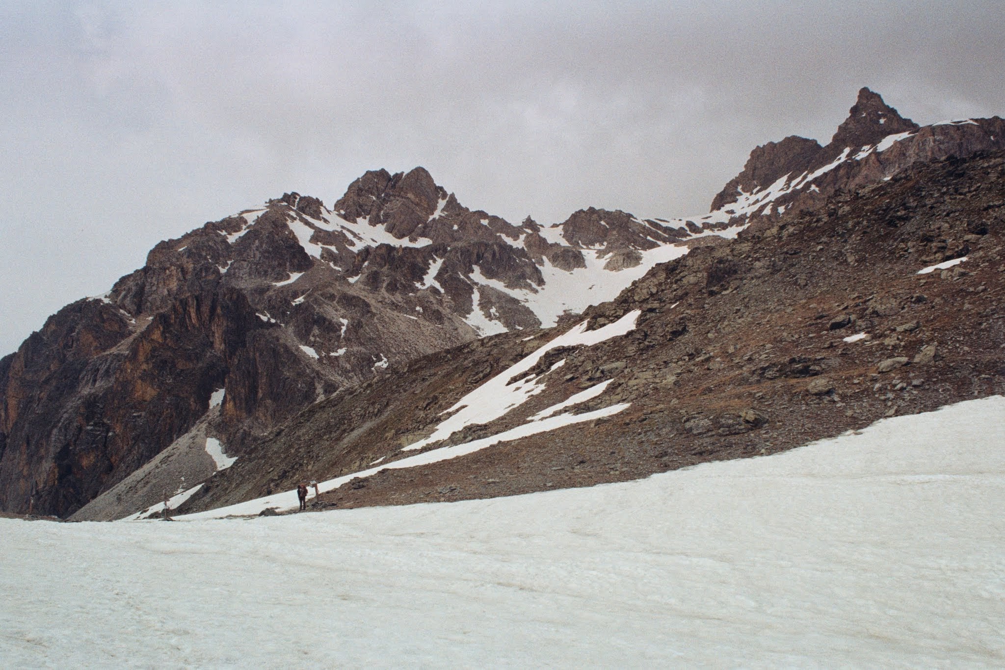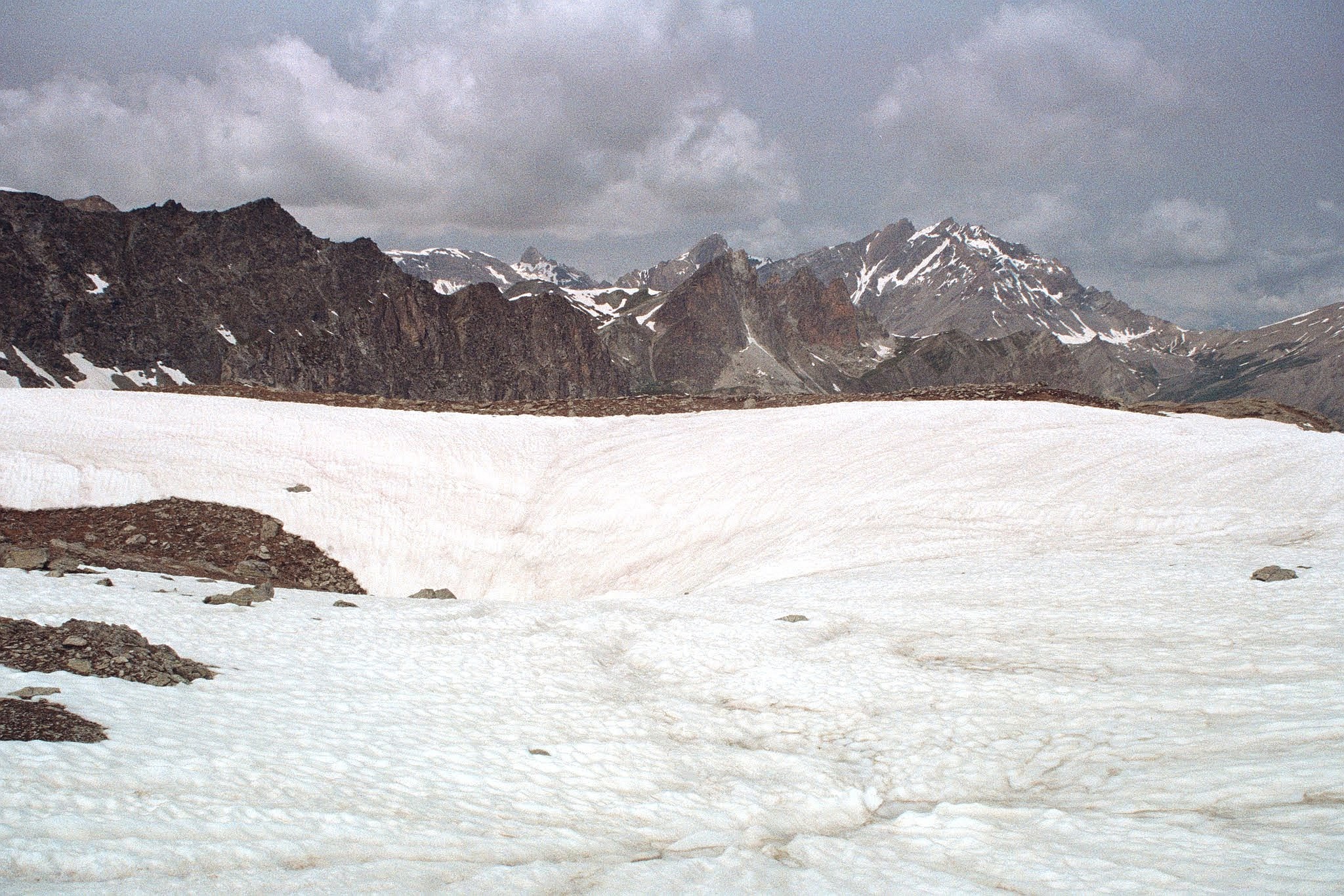 Nam wydało się zbyt szybkie i zbyt proste. Wdrapaliśmy się na Col de Marinet, do której można też było dojść podchodząc znad jeziorek, ale przejście stamtąd do włoskiego biwaku Barenghi (sensownego miejsca na deszczową noc) wyglądało na bardzo trudne. Kopny śnieg, stromo i do tego ścigał nas chyba nieunikniony deszcz.