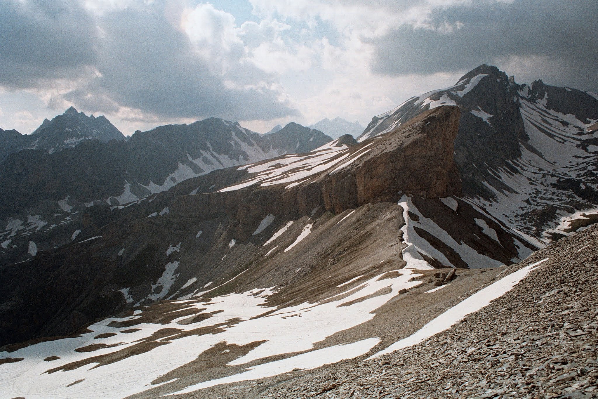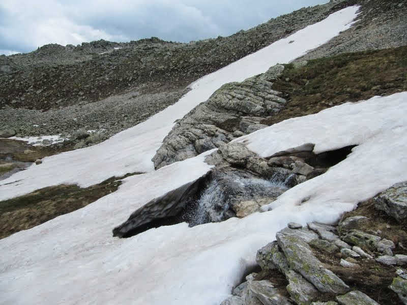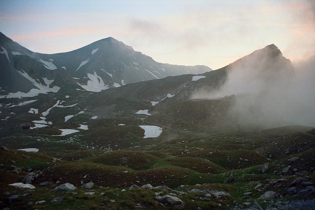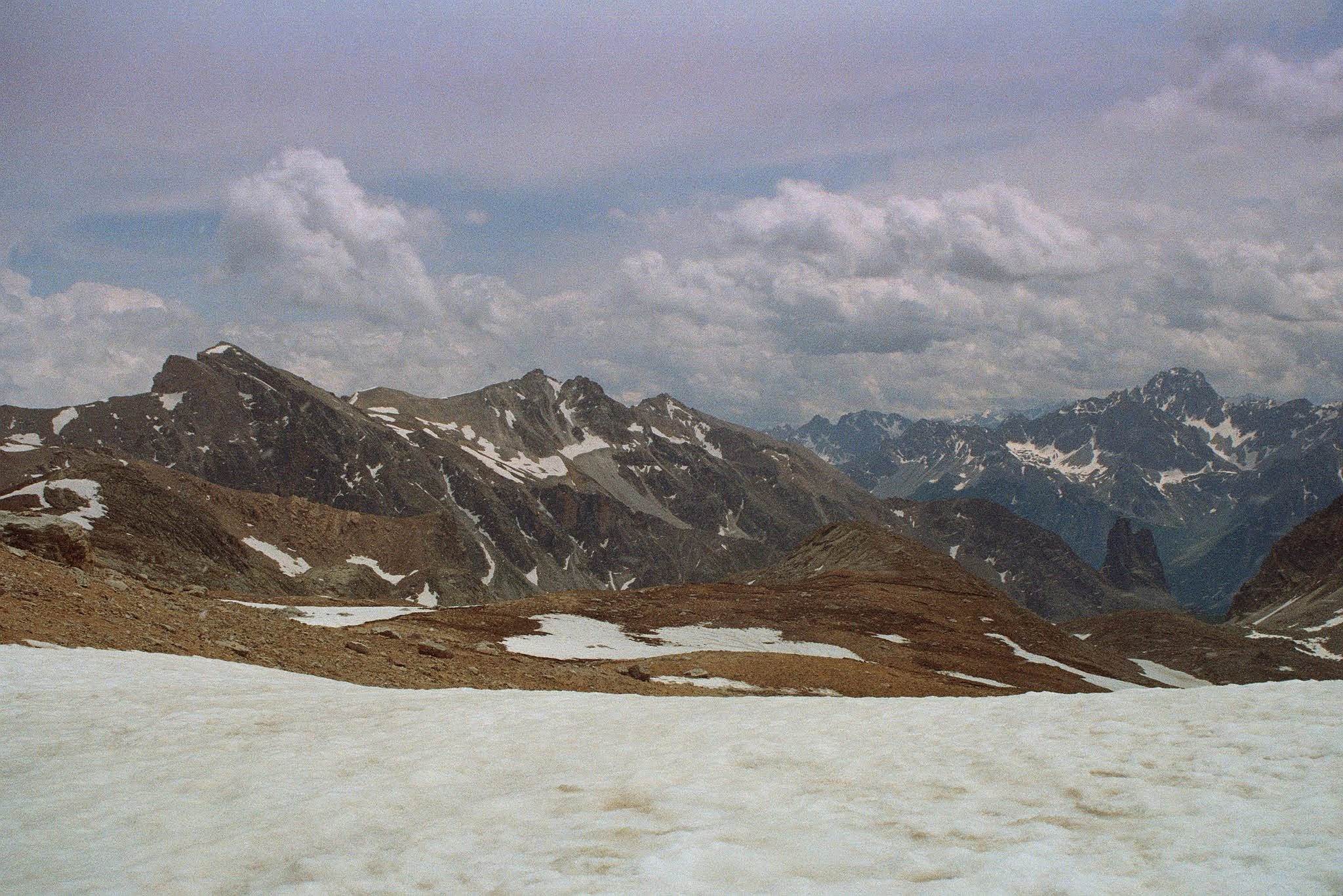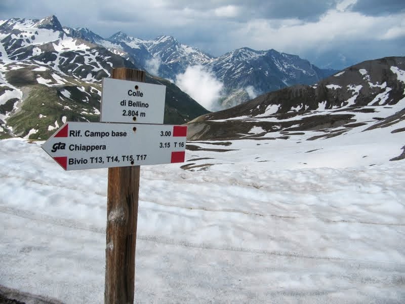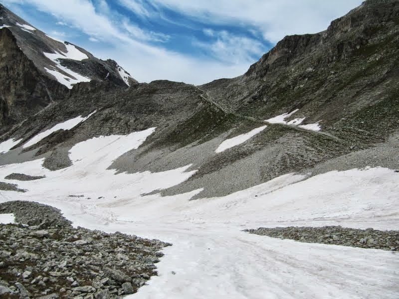 Nam wydało się zbyt szybkie i zbyt proste. Wdrapaliśmy się na Col de Marinet, do której można też było dojść podchodząc znad jeziorek, ale przejście stamtąd do włoskiego biwaku Barenghi (sensownego miejsca na deszczową noc) wyglądało na bardzo trudne. Kopny śnieg, stromo i do tego ścigał nas chyba nieunikniony deszcz.