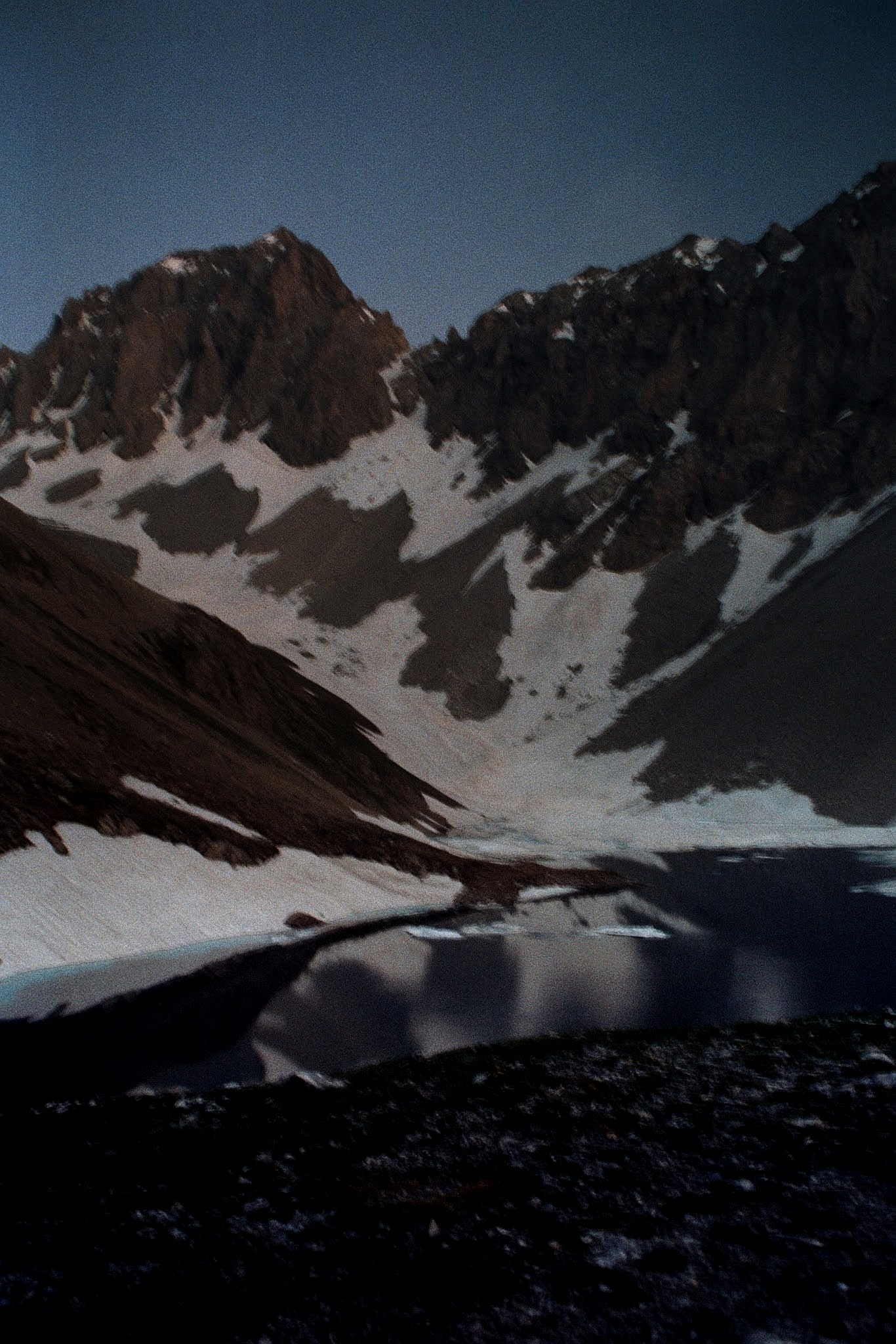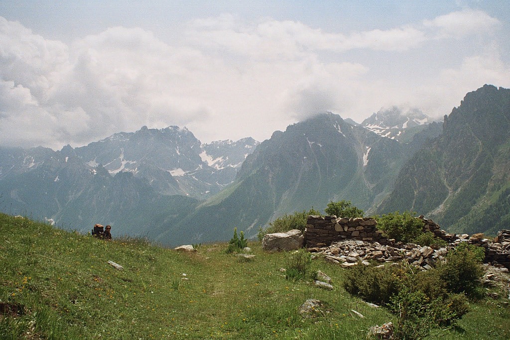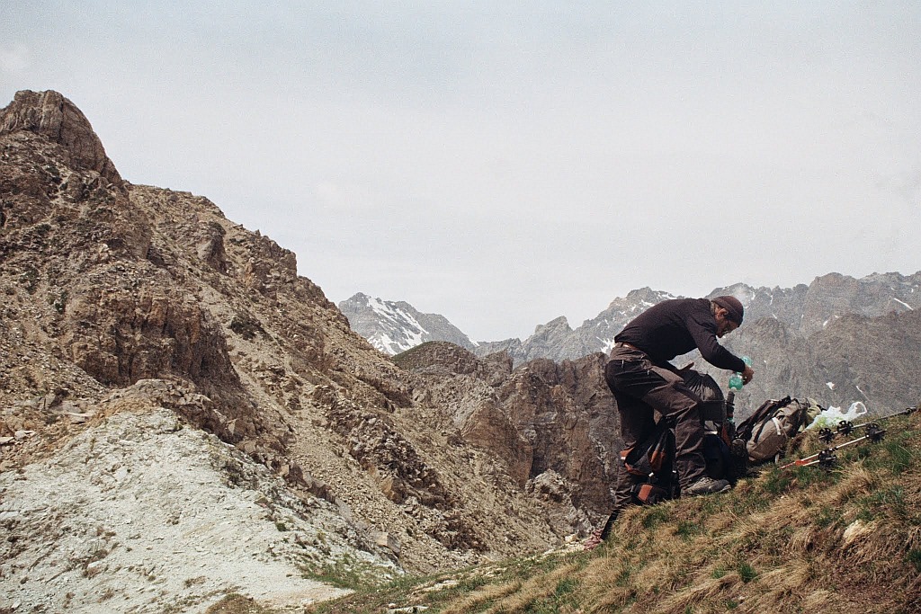 <—Noc była zimna i wietrzna, ale zasłaniał nas dach. Nie padało, a pozostałe z poprzedniego dnia kałuże pozamarzały. Spaliśmy na 2300 m, więc nic dziwnego. Próba uprania skarpet w korycie z bieżącą wodą skończyła się zesztywnieniem rąk. Trudno je było potem rozgrzać. Na lewo od nas czyli w stronę wylotu doliny góry wydawały się nieciekawe. Zerodowane pagóry, pełne stromych kruszyzn, na dużych połaciach ogołocone z roślin. Poszliśmy w prawo w kierunku wysokich gór.