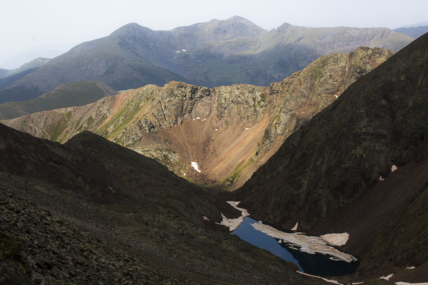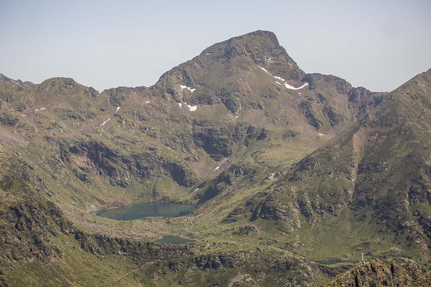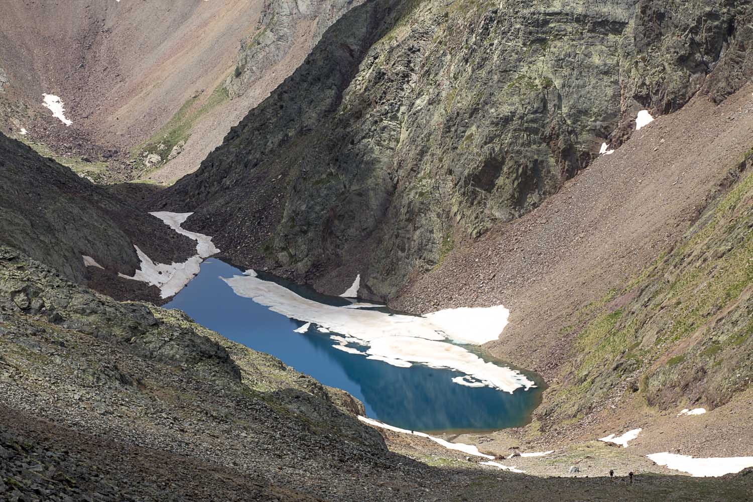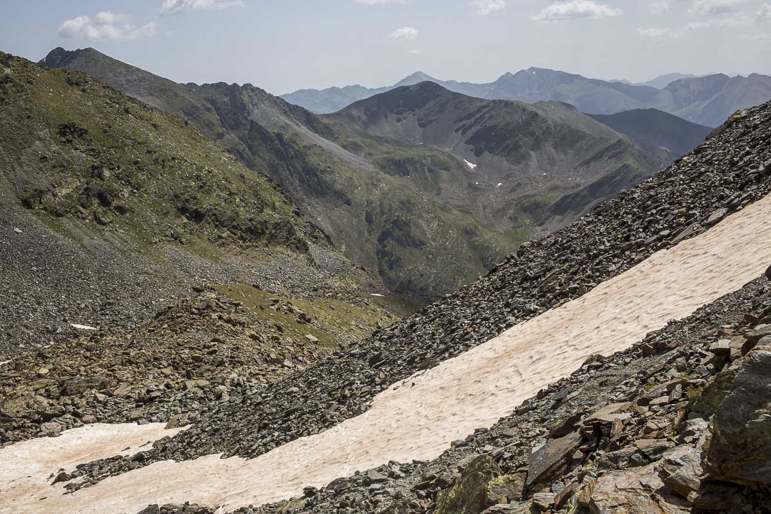 To nie był znakowany szlak, w porównaniu z równoległym GR11 był mało wydeptany, ledwo widoczny, czasem zupełnie mi znikał. Było stromo, zabrałam za mało wody i gdyby nie śnieg usmażyłabym się na tej wystawionej prosto na wschód rozgrzanej ścianie. W wyższych piętrach zrobiło się bardzo skaliście, typowe pirenejskie rumowisko dużych bloków, z dziurami i resztkami śniegu. Z przełęczy otworzył się wspaniały widok na doliny Comapendrosa i Baiau. Tak długo jak to było możliwe schodziłam grzbietem żeby nie stracić widoku błękitnych stawów. Najwyższy szczyt Andory -Comapendrosa wyglądał z tego miejsca jak kupa gruzu. Ścieżką wdrapywał się mężczyzna z dziewczynką. Mogłam tam też wejść zostało tylko 200 metrów w pionie, ale zupełnie mi się nie chciało.
