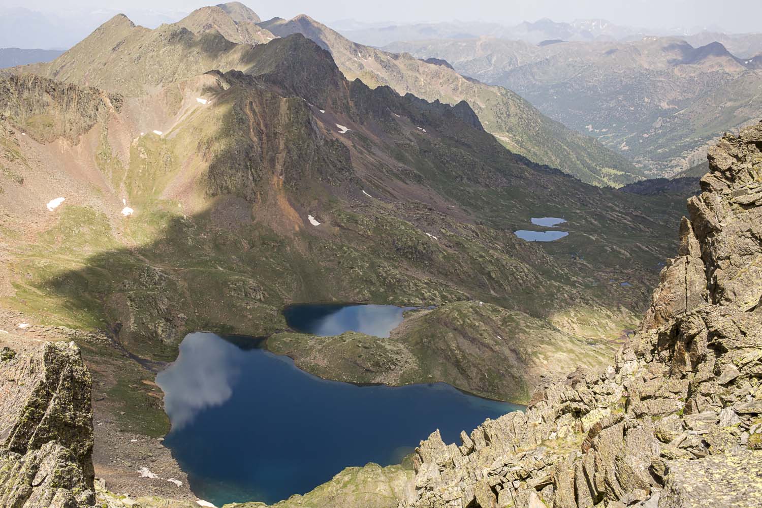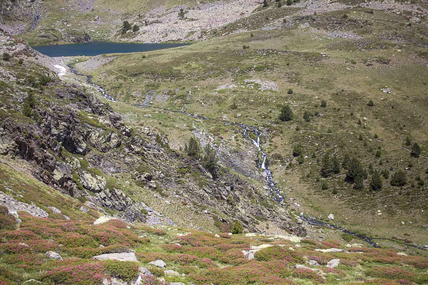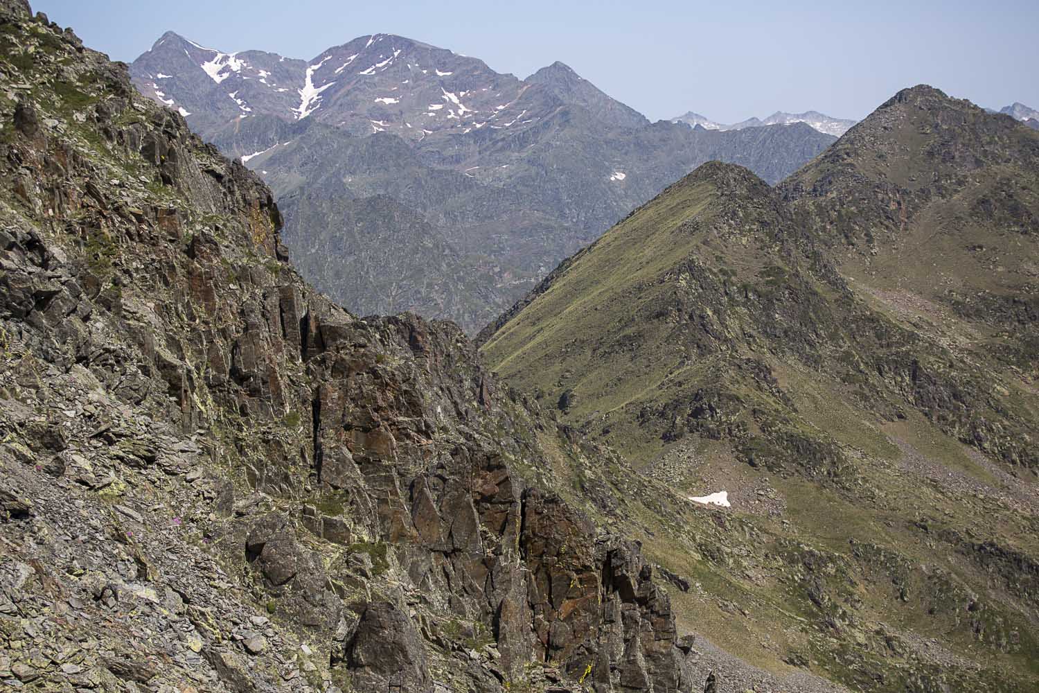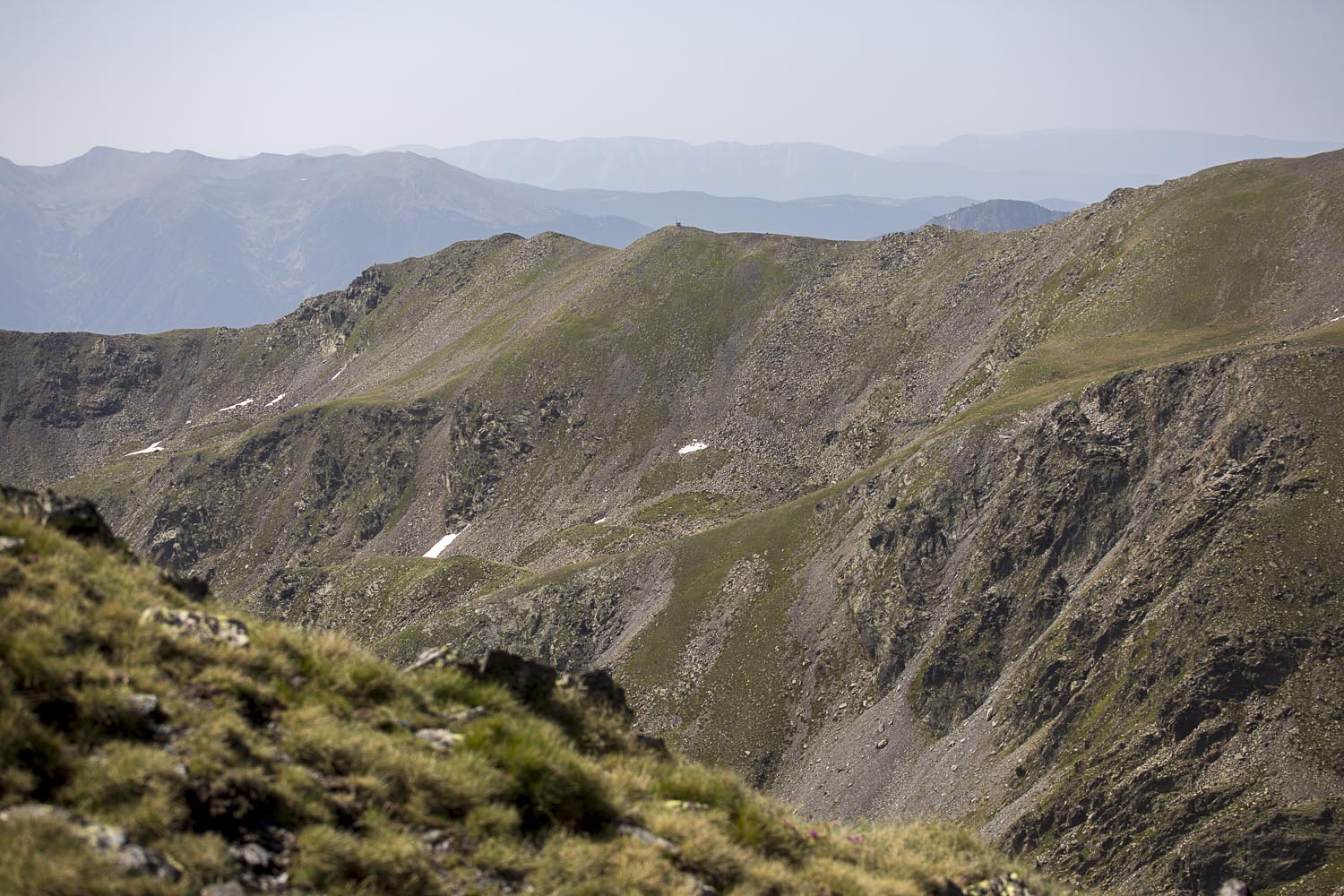 To nie był znakowany szlak, w porównaniu z równoległym GR11 był mało wydeptany, ledwo widoczny, czasem zupełnie mi znikał. Było stromo, zabrałam za mało wody i gdyby nie śnieg usmażyłabym się na tej wystawionej prosto na wschód rozgrzanej ścianie. W wyższych piętrach zrobiło się bardzo skaliście, typowe pirenejskie rumowisko dużych bloków, z dziurami i resztkami śniegu. Z przełęczy otworzył się wspaniały widok na doliny Comapendrosa i Baiau. Tak długo jak to było możliwe schodziłam grzbietem żeby nie stracić widoku błękitnych stawów. Najwyższy szczyt Andory -Comapendrosa wyglądał z tego miejsca jak kupa gruzu. Ścieżką wdrapywał się mężczyzna z dziewczynką. Mogłam tam też wejść zostało tylko 200 metrów w pionie, ale zupełnie mi się nie chciało.