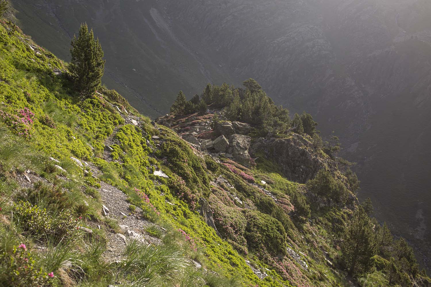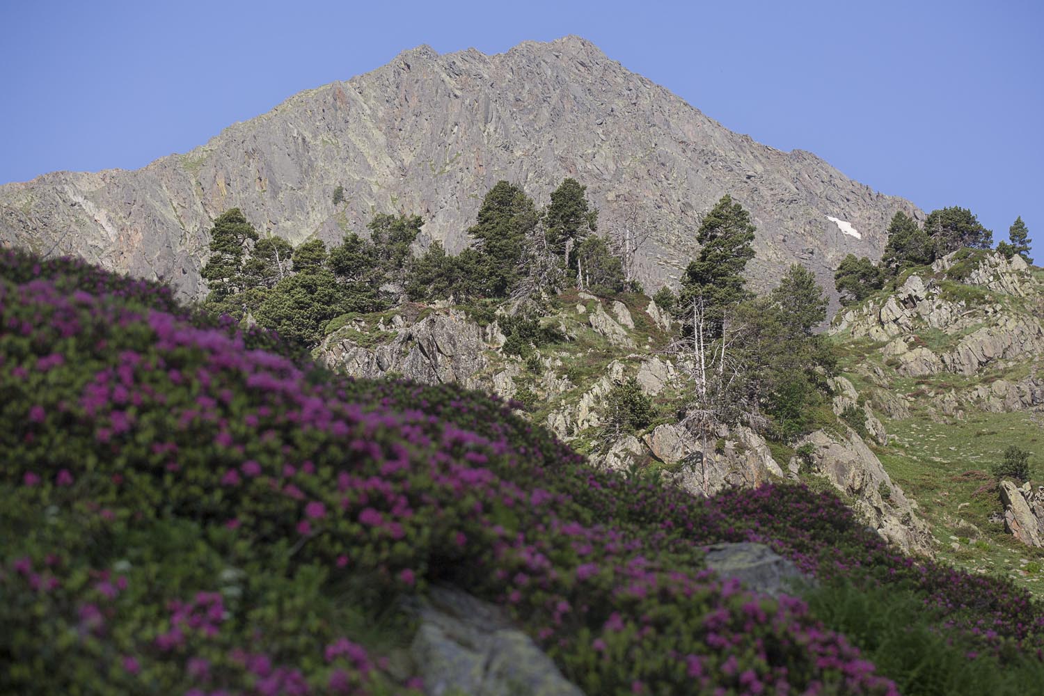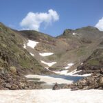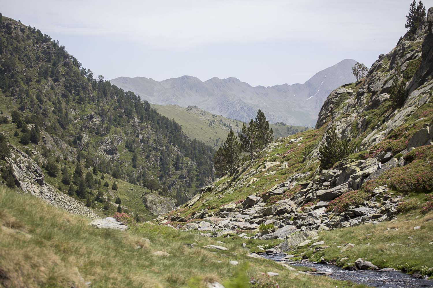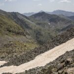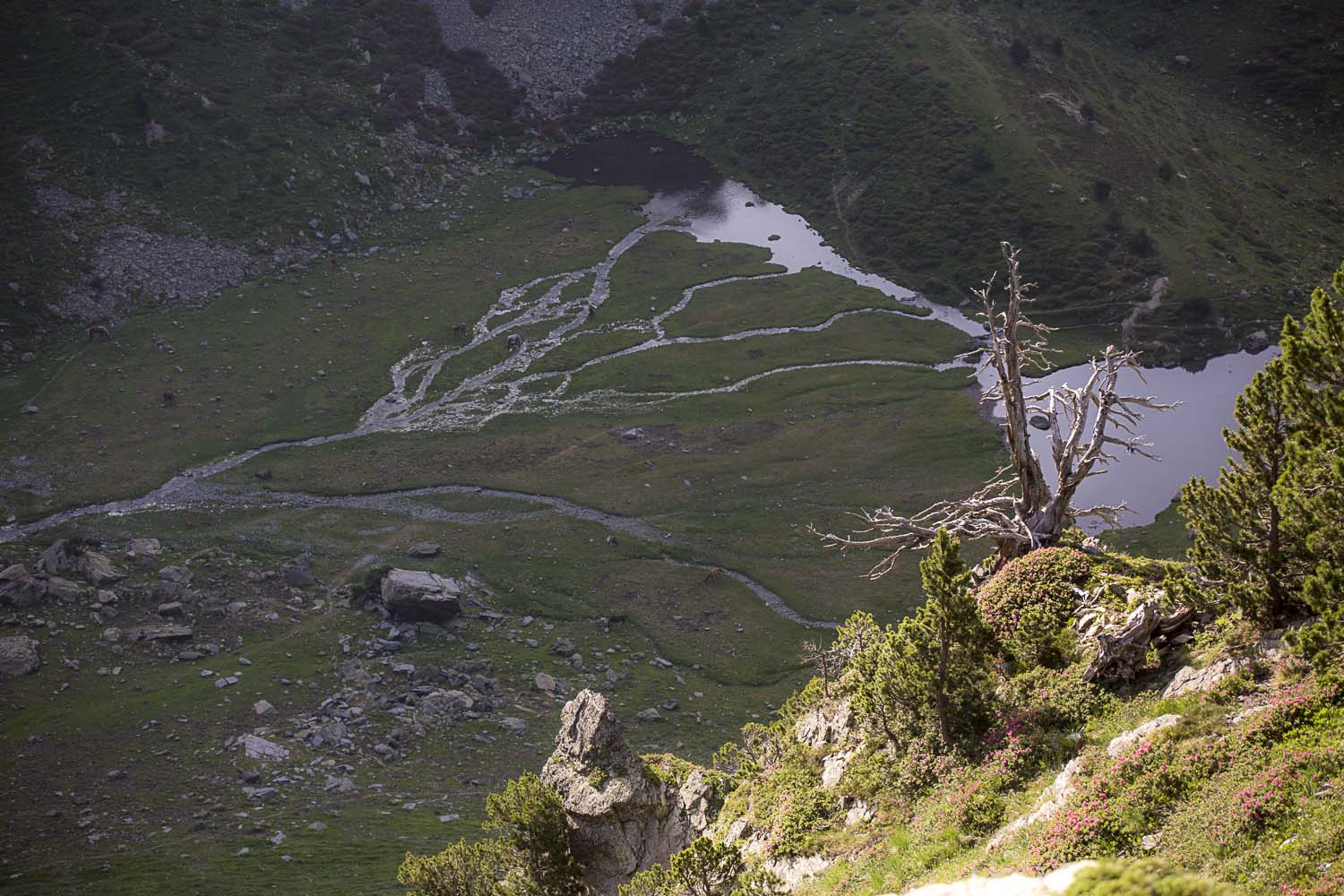 To nie był znakowany szlak, w porównaniu z równoległym GR11 był mało wydeptany, ledwo widoczny, czasem zupełnie mi znikał. Było stromo, zabrałam za mało wody i gdyby nie śnieg usmażyłabym się na tej wystawionej prosto na wschód rozgrzanej ścianie. W wyższych piętrach zrobiło się bardzo skaliście, typowe pirenejskie rumowisko dużych bloków, z dziurami i resztkami śniegu. Z przełęczy otworzył się wspaniały widok na doliny Comapendrosa i Baiau. Tak długo jak to było możliwe schodziłam grzbietem żeby nie stracić widoku błękitnych stawów. Najwyższy szczyt Andory -Comapendrosa wyglądał z tego miejsca jak kupa gruzu. Ścieżką wdrapywał się mężczyzna z dziewczynką. Mogłam tam też wejść zostało tylko 200 metrów w pionie, ale zupełnie mi się nie chciało.