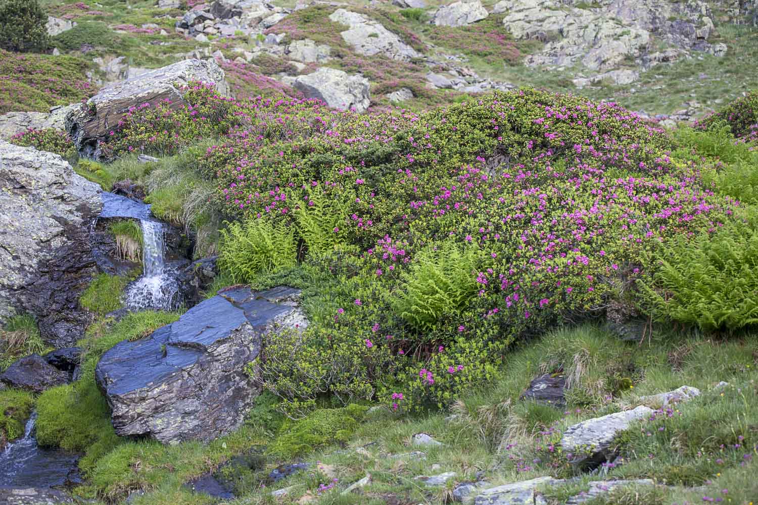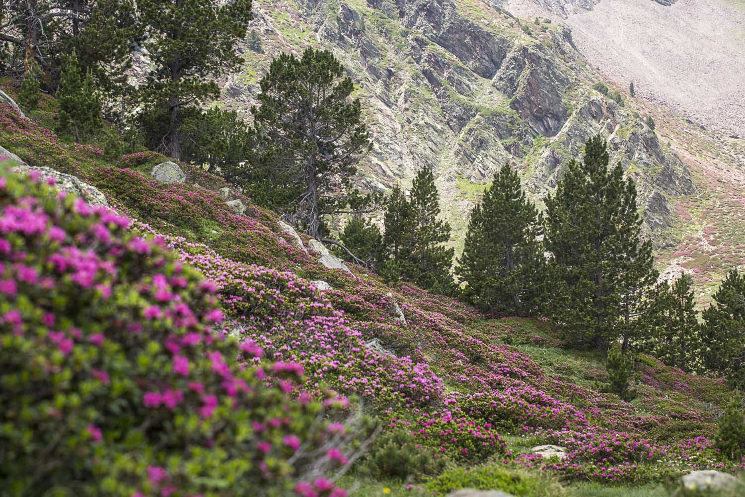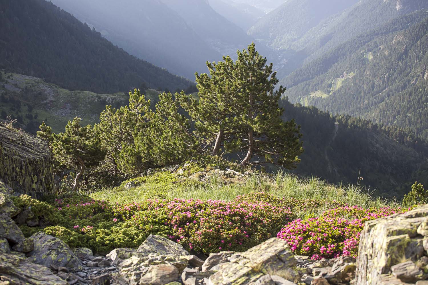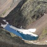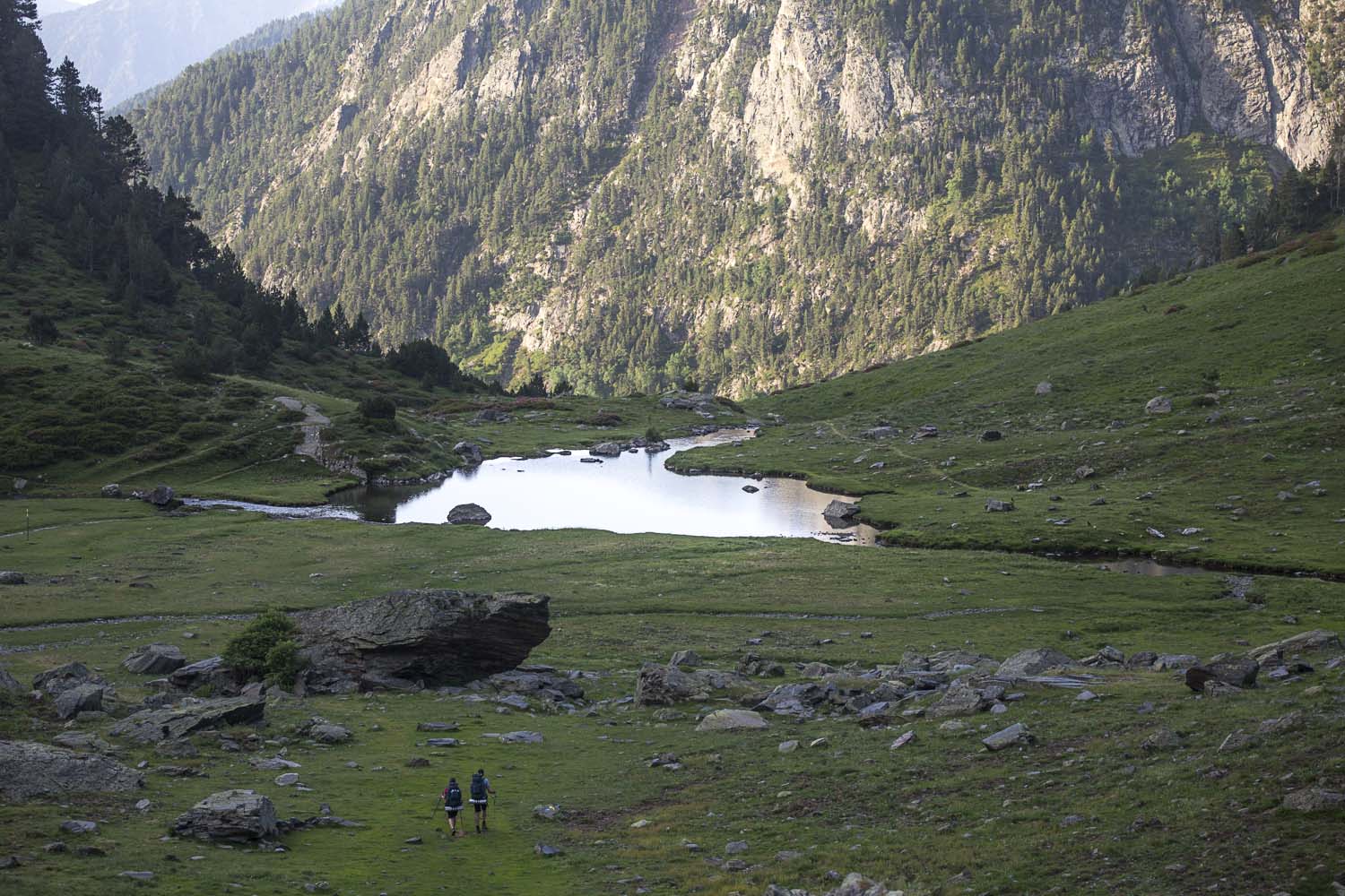 To nie był znakowany szlak, w porównaniu z równoległym GR11 był mało wydeptany, ledwo widoczny, czasem zupełnie mi znikał. Było stromo, zabrałam za mało wody i gdyby nie śnieg usmażyłabym się na tej wystawionej prosto na wschód rozgrzanej ścianie. W wyższych piętrach zrobiło się bardzo skaliście, typowe pirenejskie rumowisko dużych bloków, z dziurami i resztkami śniegu. Z przełęczy otworzył się wspaniały widok na doliny Comapendrosa i Baiau. Tak długo jak to było możliwe schodziłam grzbietem żeby nie stracić widoku błękitnych stawów. Najwyższy szczyt Andory -Comapendrosa wyglądał z tego miejsca jak kupa gruzu. Ścieżką wdrapywał się mężczyzna z dziewczynką. Mogłam tam też wejść zostało tylko 200 metrów w pionie, ale zupełnie mi się nie chciało.