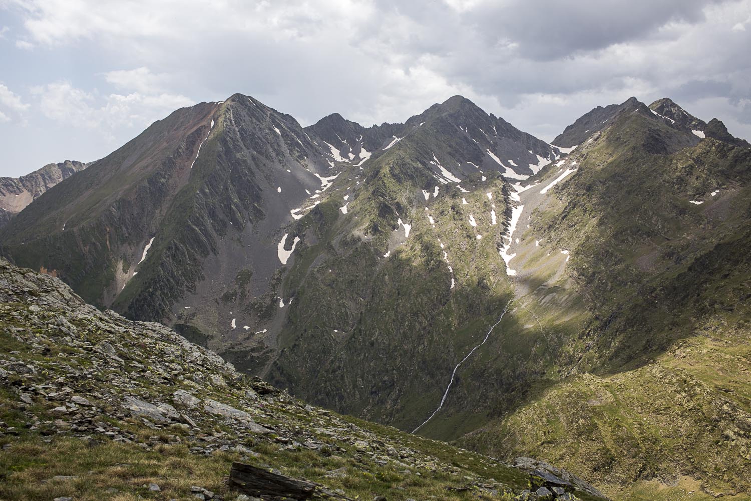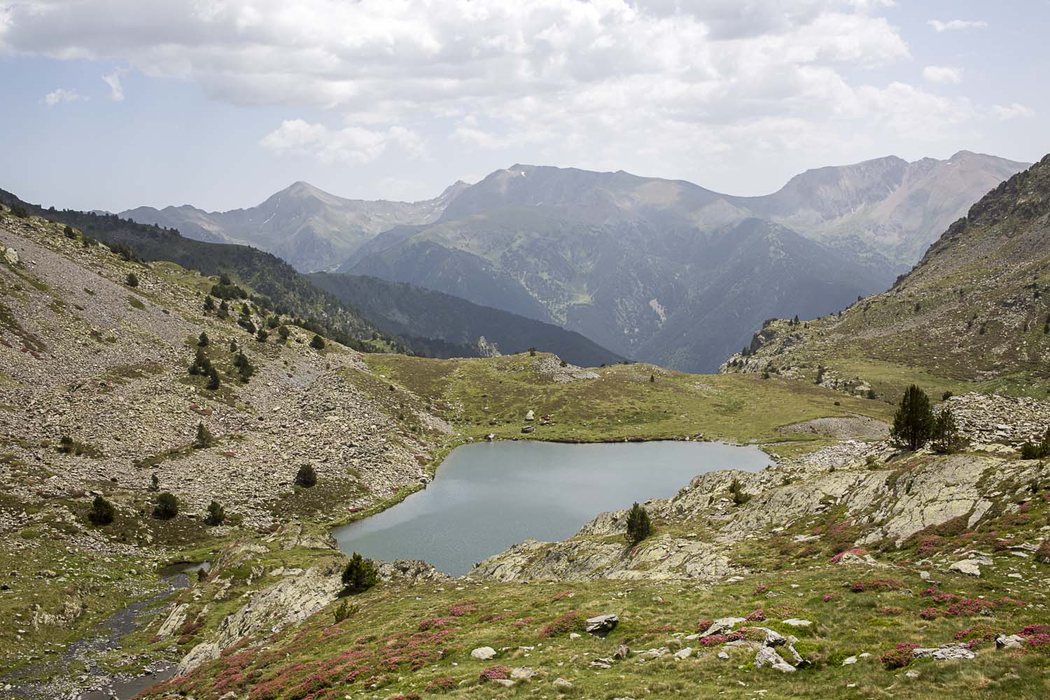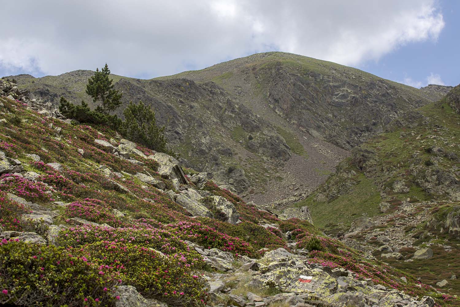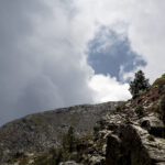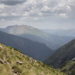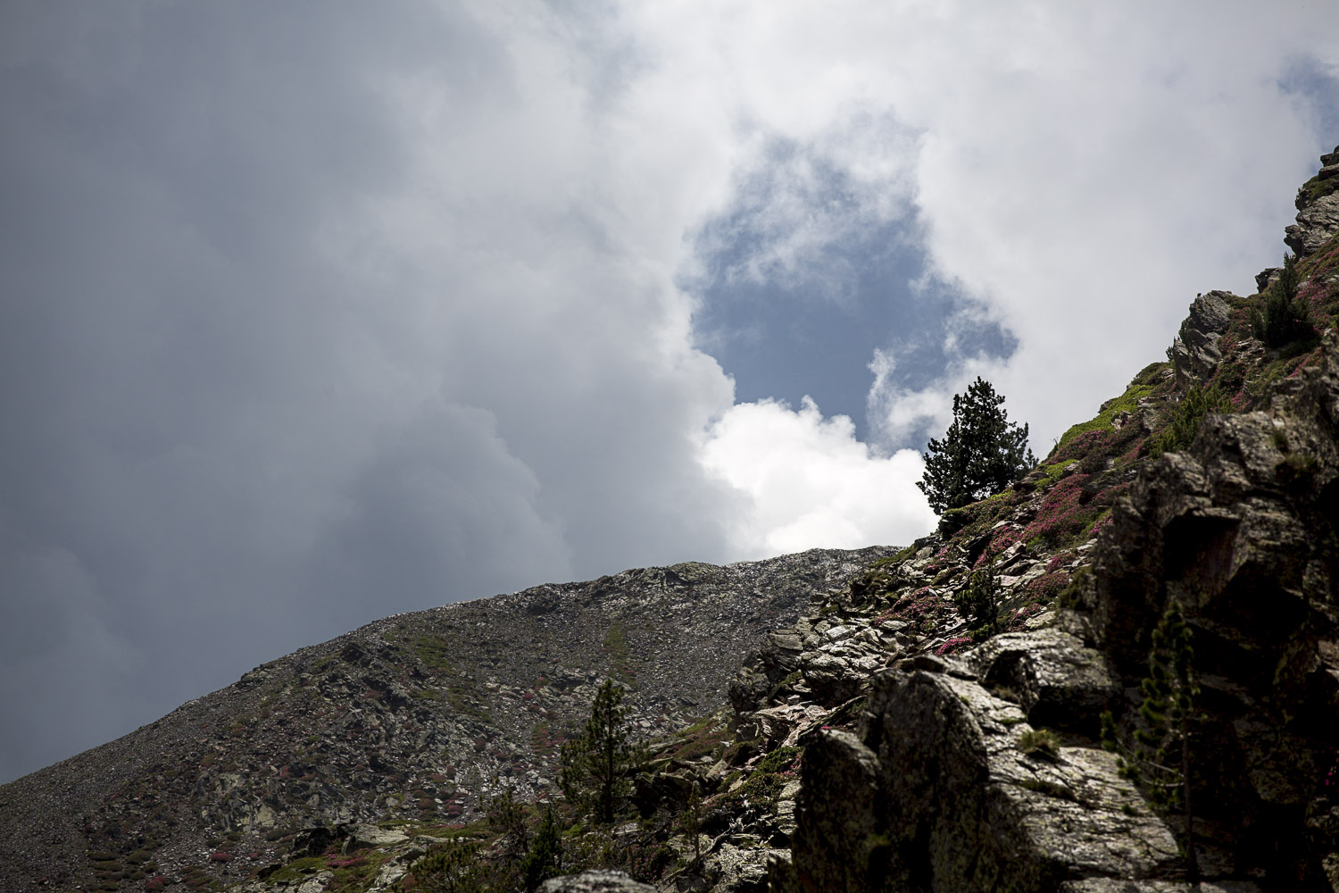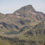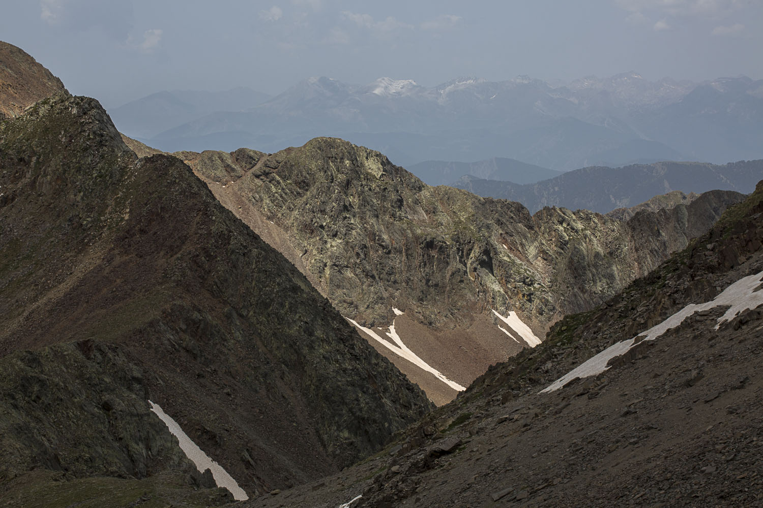 Podejście na przełączkę oddzielającą Arcalis od jeziorek Angonella zapamiętałam sprzed lat jako bardzo strome. Błoto, ruchomy piarg. Teraz to oznakowany szlak i jak zwykle w miejscach gdzie ludzie powtarzają dokładnie tą samą trasę utworzyła się już solidna ścieżka. Widoczność była doskonała, zza Port De Rat wynurzył się Pica d’Estats- pierwszy trzytysięcznik. Wypatrywałam przełęczy, z której zeszliśmy kiedyś wiosną z Jose (i trafił w nas piorun), ale teraz bez śniegu trudno było rozpoznać, która to. Zejście nad jeziorka też jest teraz łatwą ścieżką, choć nadal jest tam bardzo stromo. Kiedyś opuszczałam się tam krok po kroku w ruchomych piargach, nawet nie wiem czy to nie było czasem trochę obok, kilkadziesiąt metrów dalej na wschód. Stare dzieje, od tamtych pierwszych samotnych wędrówek minęło już prawie 20 lat. Pomyślałam, że to dziwne, że nigdy jeszcze nie spałam w schronie Angonella. Za pierwszym razem rozbiłam namiot nad pośrednim stawem nieświadoma, że kilkaset metrów dalej jest schron. Innego lata minęłam go, bo było zbyt wcześnie i teraz też musiałam go minąć. Chyba żeby zajrzeć na drugie śniadanie?… Zerknęłam, przed chatką kłębił się już tłumek. Poszłam dalej i też zaczęłam spotykać ludzi. Nie dużo, ale przyszedł mi do głowy pomysł żeby opuścić szlak i wdrapać się na grań. Nie było to trudne. Wysoko, po szczytach lub troszkę niżej trawersami biegła cieniutka, może owcza ścieżka. Nie zauważyłam kiedy się zachmurzyło. Z grani był daleki widok, patrzyłam na dwie wysokie przełęcze na francusko hiszpańskiej granicy, już za Andorą. Portella de Baiau, na której jeszcze nigdy nie byłam i znaną mi Coll dels Estanys Forcats, przez którą przechodzi GR11. Z tej odległości, z góry, obie wydawały się bardzo strome. Płaty śniegu zalegały już tylko w zacienionych miejscach i byłam pewna, że da się je obejść.