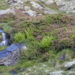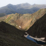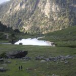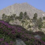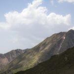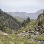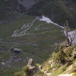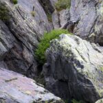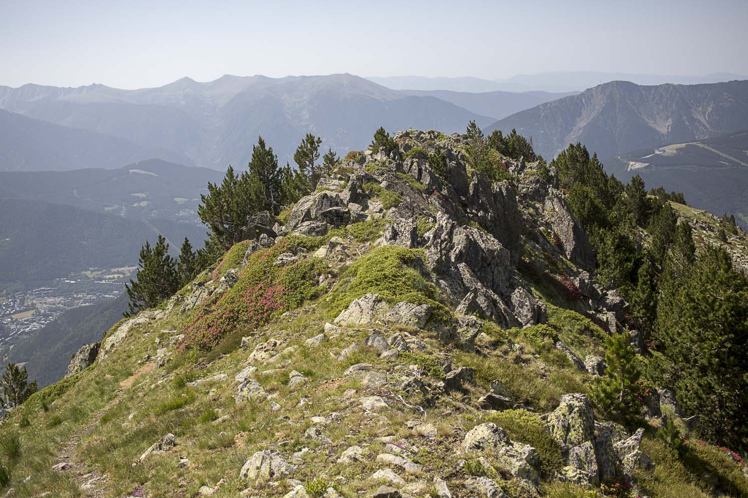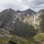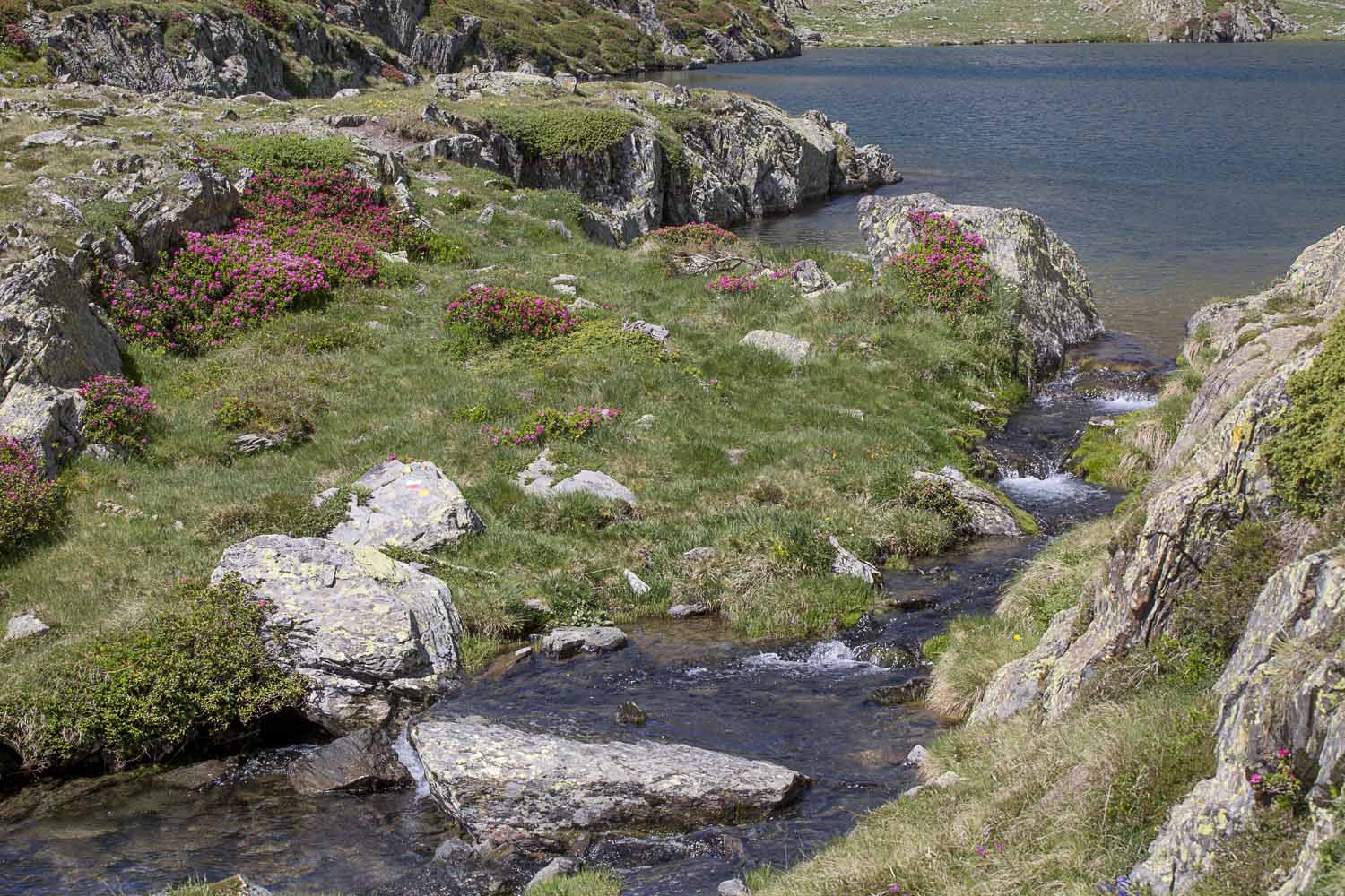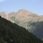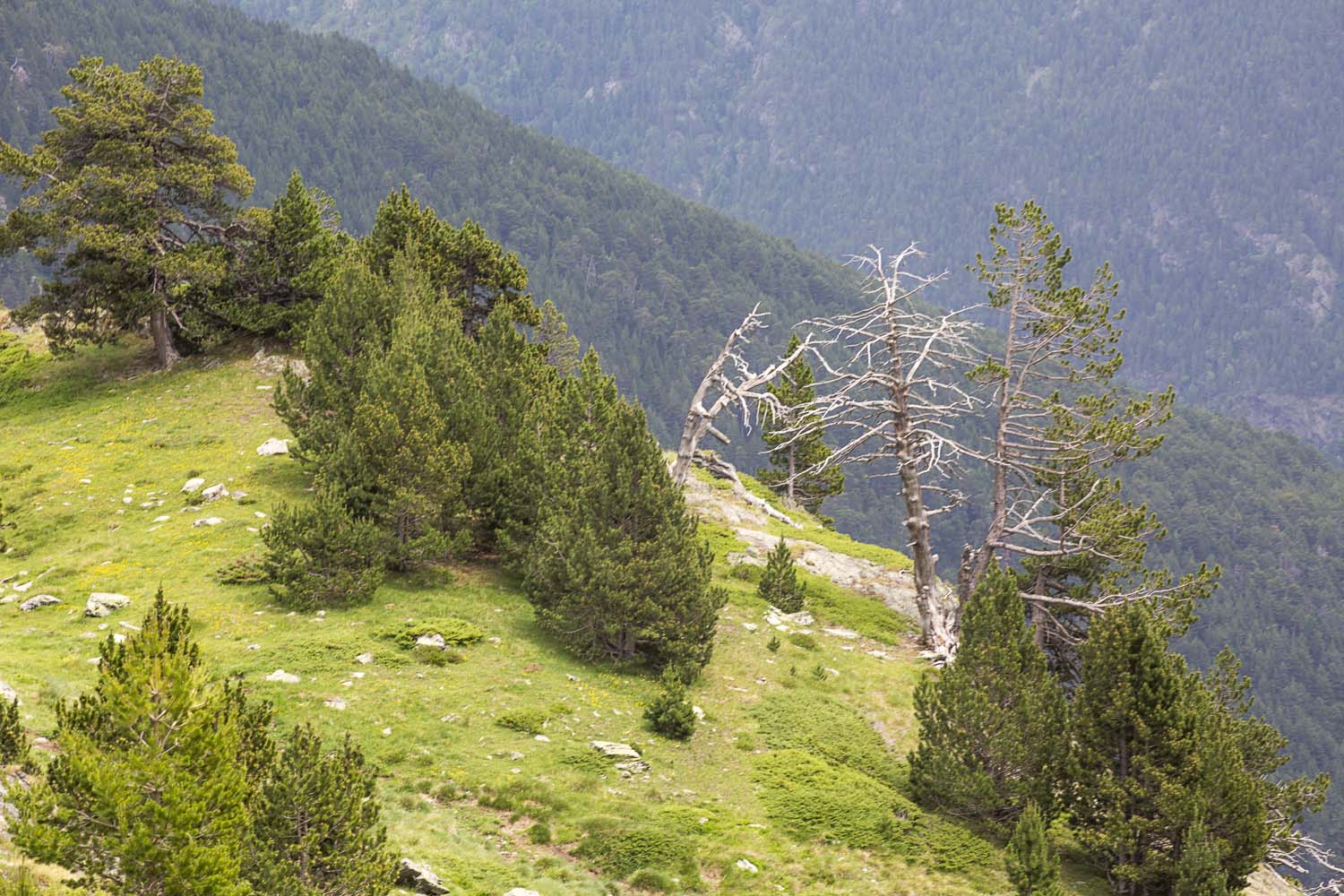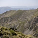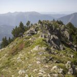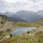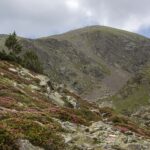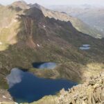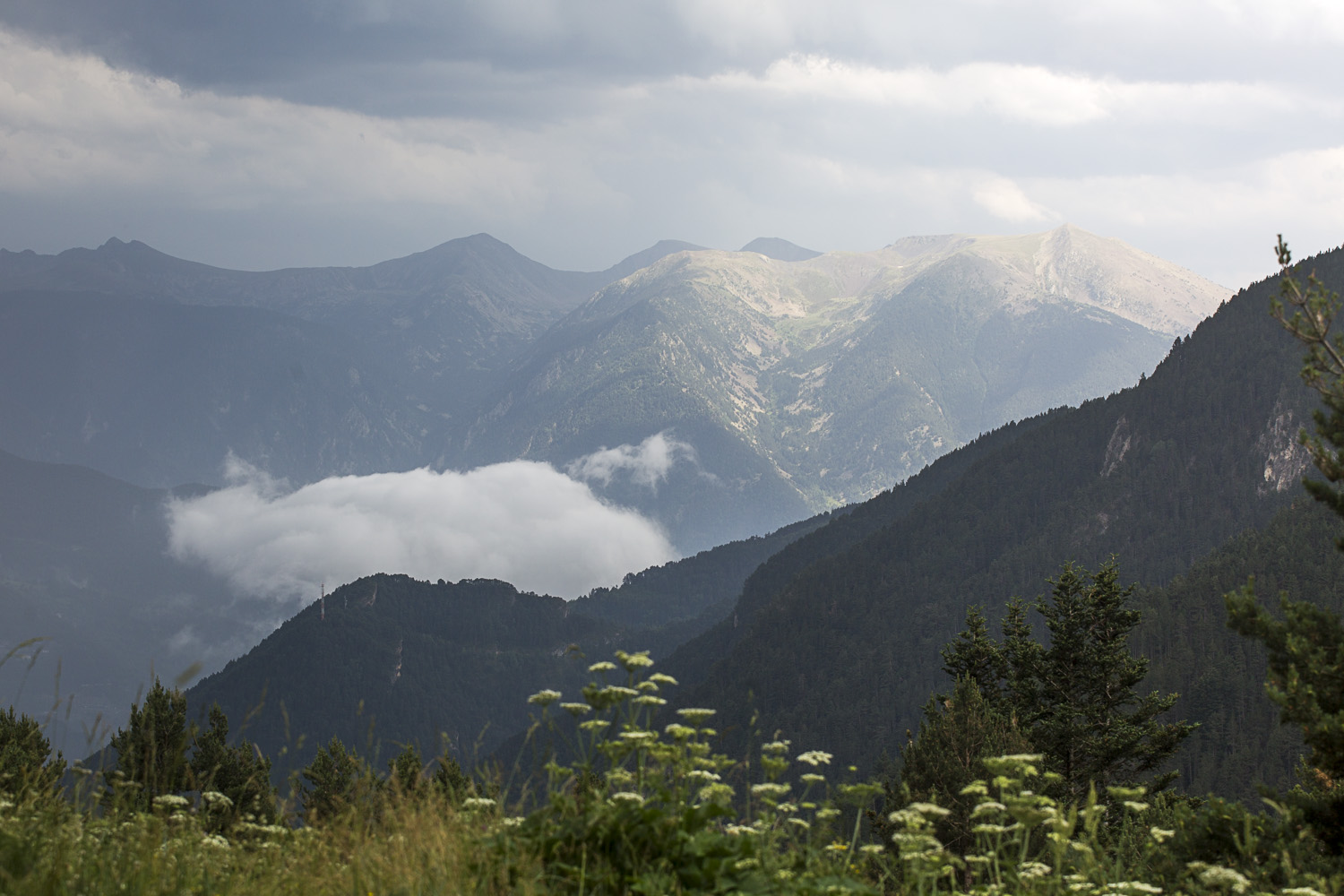 Podejście na przełączkę oddzielającą Arcalis od jeziorek Angonella zapamiętałam sprzed lat jako bardzo strome. Błoto, ruchomy piarg. Teraz to oznakowany szlak i jak zwykle w miejscach gdzie ludzie powtarzają dokładnie tą samą trasę utworzyła się już solidna ścieżka. Widoczność była doskonała, zza Port De Rat wynurzył się Pica d’Estats- pierwszy trzytysięcznik. Wypatrywałam przełęczy, z której zeszliśmy kiedyś wiosną z Jose (i trafił w nas piorun), ale teraz bez śniegu trudno było rozpoznać, która to. Zejście nad jeziorka też jest teraz łatwą ścieżką, choć nadal jest tam bardzo stromo. Kiedyś opuszczałam się tam krok po kroku w ruchomych piargach, nawet nie wiem czy to nie było czasem trochę obok, kilkadziesiąt metrów dalej na wschód. Stare dzieje, od tamtych pierwszych samotnych wędrówek minęło już prawie 20 lat. Pomyślałam, że to dziwne, że nigdy jeszcze nie spałam w schronie Angonella. Za pierwszym razem rozbiłam namiot nad pośrednim stawem nieświadoma, że kilkaset metrów dalej jest schron. Innego lata minęłam go, bo było zbyt wcześnie i teraz też musiałam go minąć. Chyba żeby zajrzeć na drugie śniadanie?… Zerknęłam, przed chatką kłębił się już tłumek. Poszłam dalej i też zaczęłam spotykać ludzi. Nie dużo, ale przyszedł mi do głowy pomysł żeby opuścić szlak i wdrapać się na grań. Nie było to trudne. Wysoko, po szczytach lub troszkę niżej trawersami biegła cieniutka, może owcza ścieżka. Nie zauważyłam kiedy się zachmurzyło. Z grani był daleki widok, patrzyłam na dwie wysokie przełęcze na francusko hiszpańskiej granicy, już za Andorą. Portella de Baiau, na której jeszcze nigdy nie byłam i znaną mi Coll dels Estanys Forcats, przez którą przechodzi GR11. Z tej odległości, z góry, obie wydawały się bardzo strome. Płaty śniegu zalegały już tylko w zacienionych miejscach i byłam pewna, że da się je obejść.
