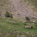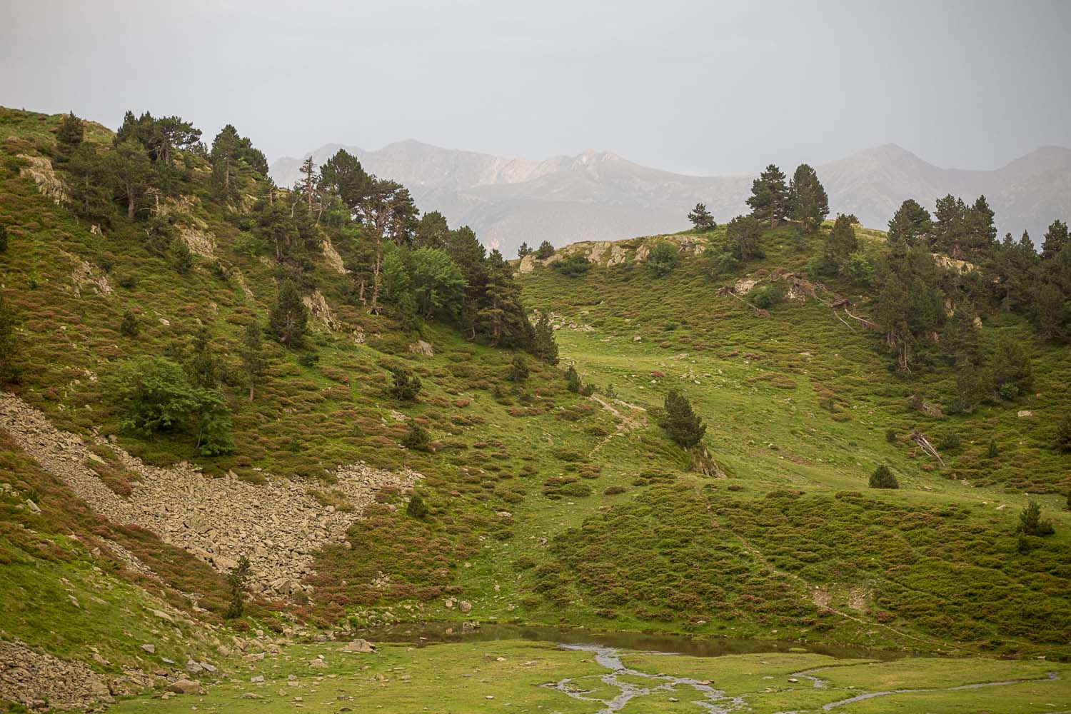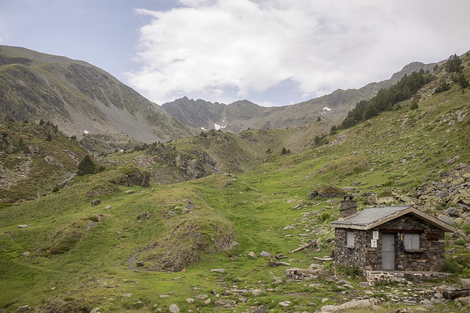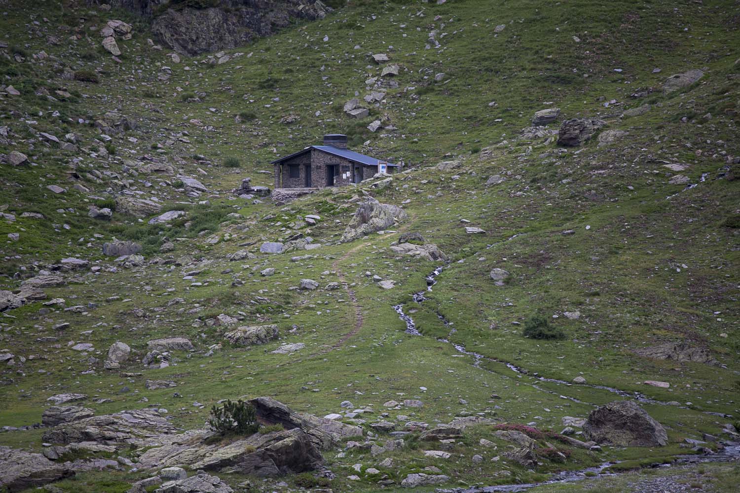 Sosny ociekały zgubiłam ścieżkę, ale na jakimś lawinisku dało się zejść po skałach do szlaku. Teraz było już prosto. Tyle, że znów nadszedł deszcz, być może chmura jednak wróciła. Łąka przed Pla de Estany nasiąkła, buty człapały. W skałach schroniło się kilka świstaków. Drzwi schronu były otwarte, już z daleka widziałam, że ktoś tam jest.