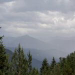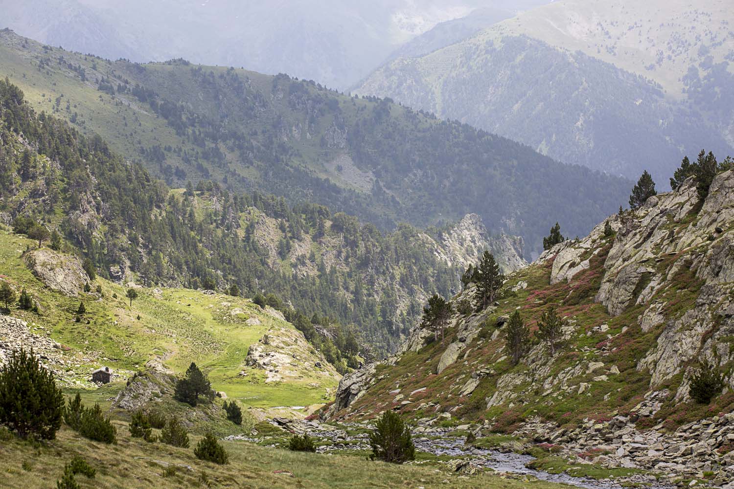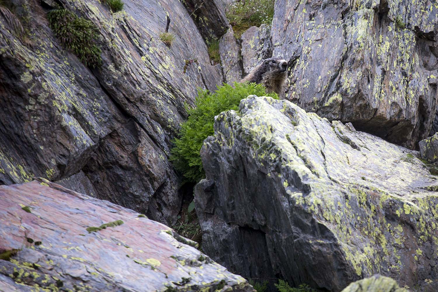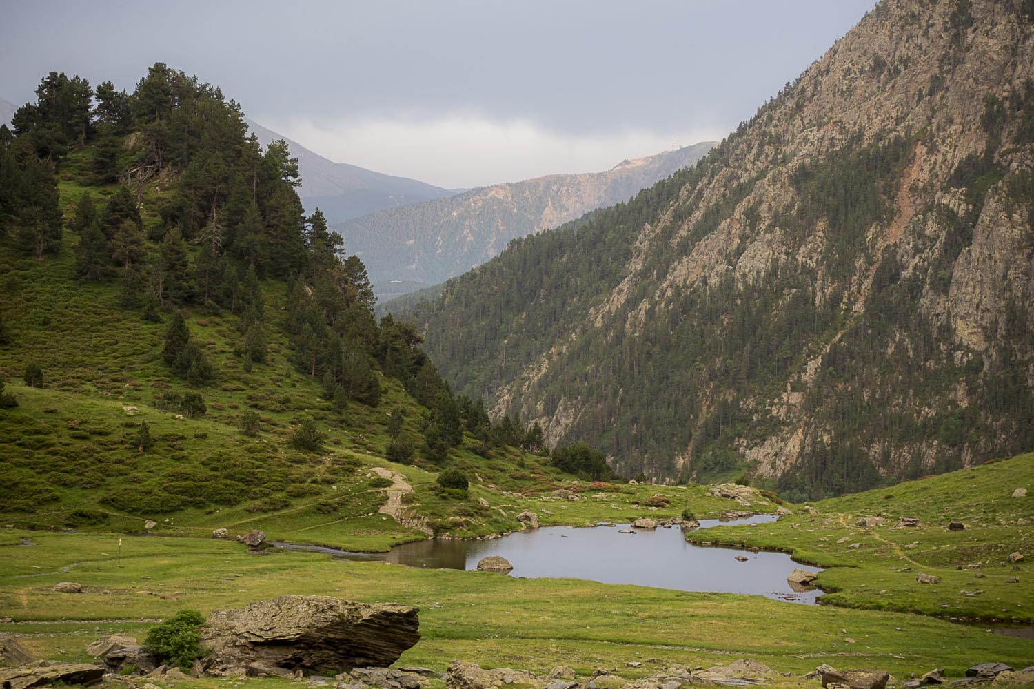 Sosny ociekały zgubiłam ścieżkę, ale na jakimś lawinisku dało się zejść po skałach do szlaku. Teraz było już prosto. Tyle, że znów nadszedł deszcz, być może chmura jednak wróciła. Łąka przed Pla de Estany nasiąkła, buty człapały. W skałach schroniło się kilka świstaków. Drzwi schronu były otwarte, już z daleka widziałam, że ktoś tam jest.