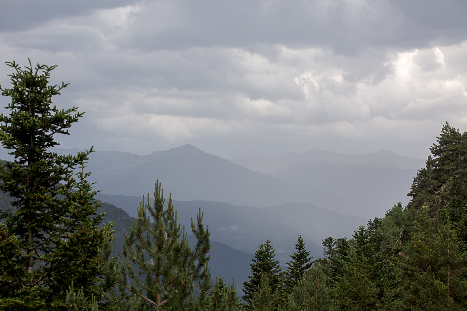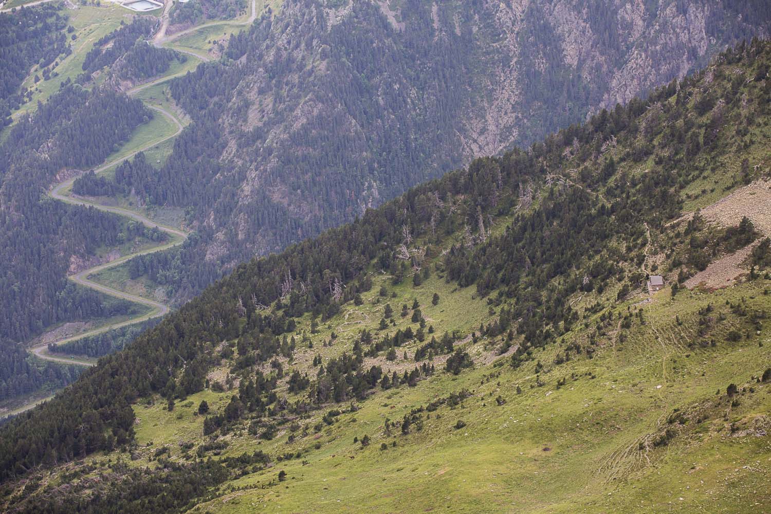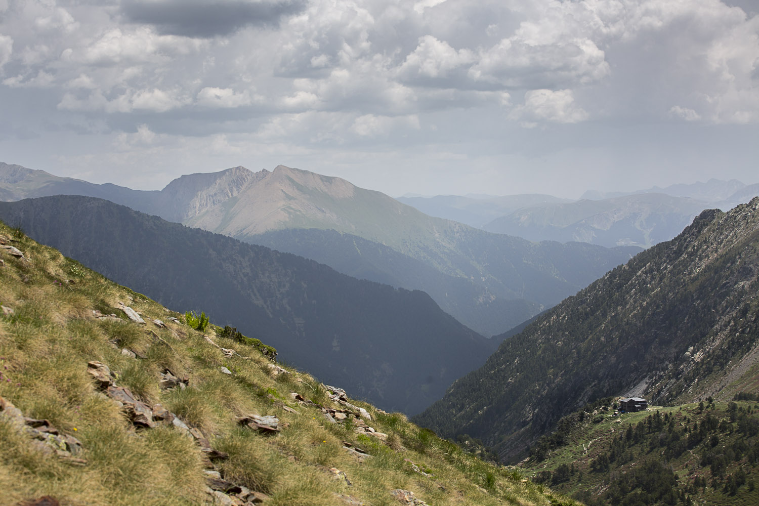 My ruszyłyśmy w dół, bo chmura sczerniała i zaczęła się formować burza. Nie szłyśmy razem, panie dogoniła reszta rodziny, potem ja skręciłam w skrót, a oni zostali na szlaku i znów zamieniliśmy parę słów w schronisku. Miło. Miło też było spotkać moich wczorajszych znajomych z Pla de Estany. Zastanawiałam się nawet czy nie zostać z nimi w schronisku na noc. Wcześniejszy pomysł, żeby iść dalej wzdłuż granicy zupełnie mi się przestał podobać. Burza wśród wyciągów i dróg, bez schronu. Z góry widać było cały ten szlak. Nartostrady, maszty, nawet szosa. Zamiast tego ruszyłam GPR w dół mijając po drodze kilka zziajanych grupek.