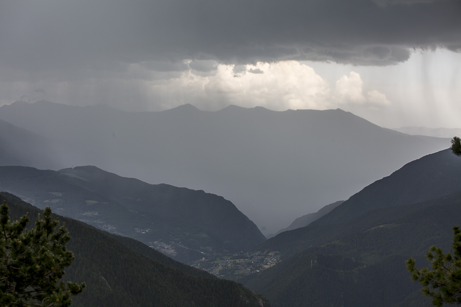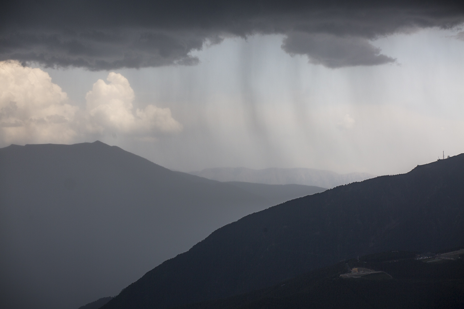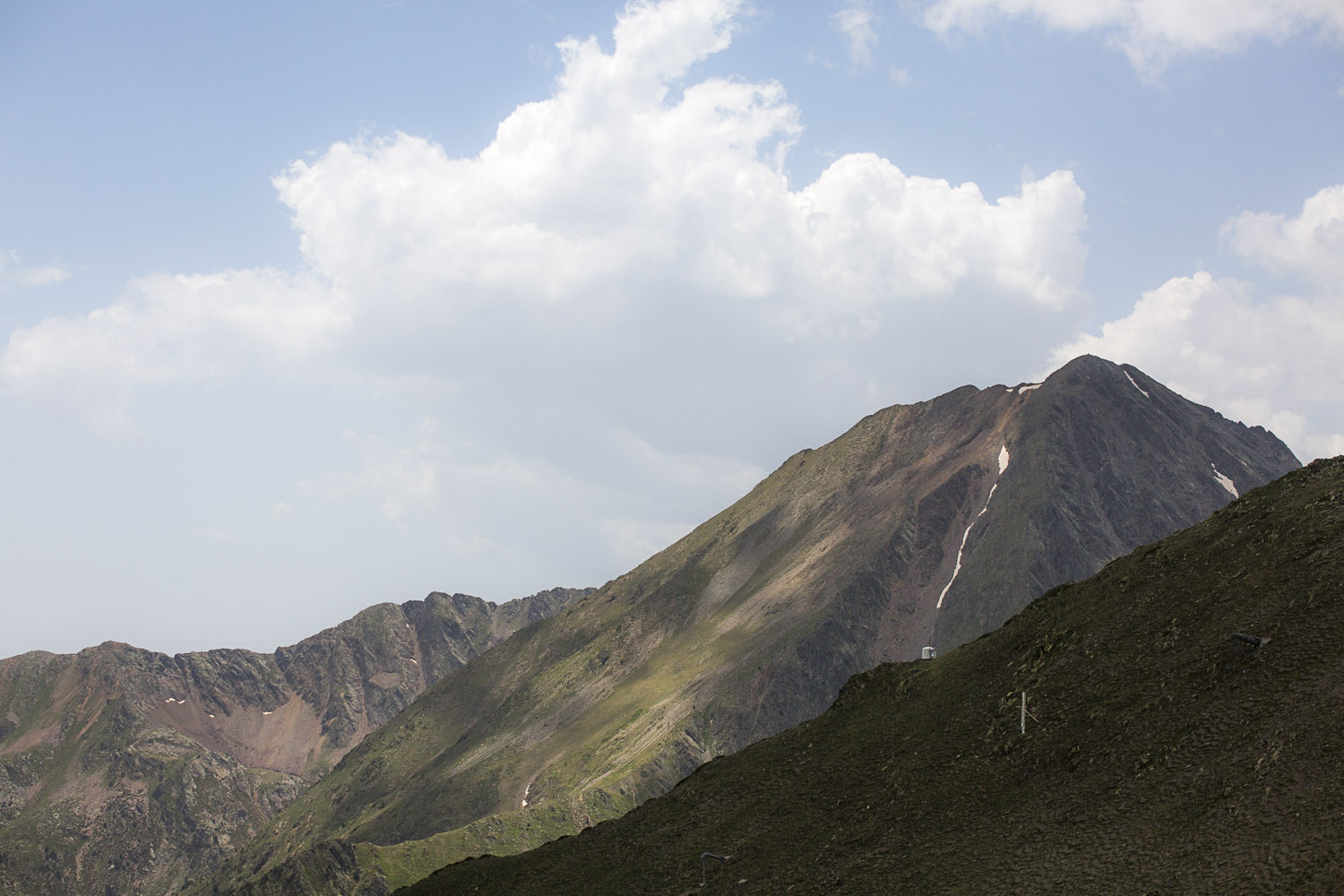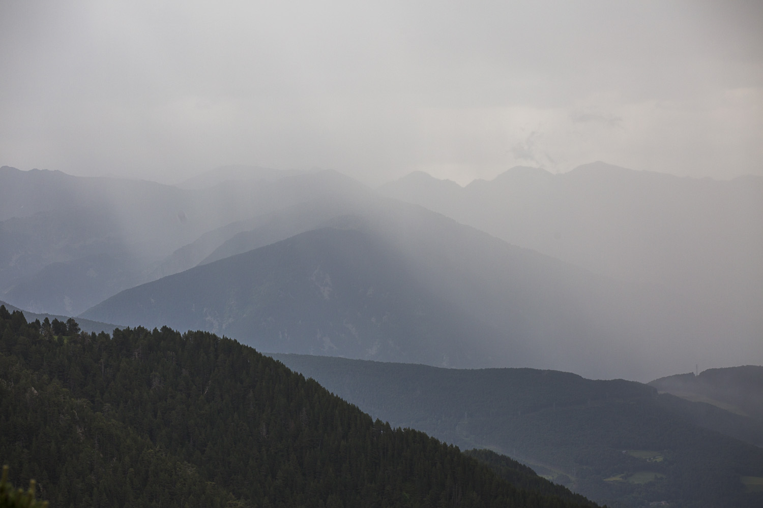 My ruszyłyśmy w dół, bo chmura sczerniała i zaczęła się formować burza. Nie szłyśmy razem, panie dogoniła reszta rodziny, potem ja skręciłam w skrót, a oni zostali na szlaku i znów zamieniliśmy parę słów w schronisku. Miło. Miło też było spotkać moich wczorajszych znajomych z Pla de Estany. Zastanawiałam się nawet czy nie zostać z nimi w schronisku na noc. Wcześniejszy pomysł, żeby iść dalej wzdłuż granicy zupełnie mi się przestał podobać. Burza wśród wyciągów i dróg, bez schronu. Z góry widać było cały ten szlak. Nartostrady, maszty, nawet szosa. Zamiast tego ruszyłam GPR w dół mijając po drodze kilka zziajanych grupek.