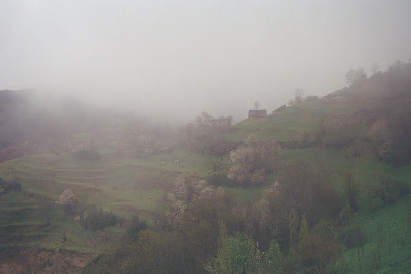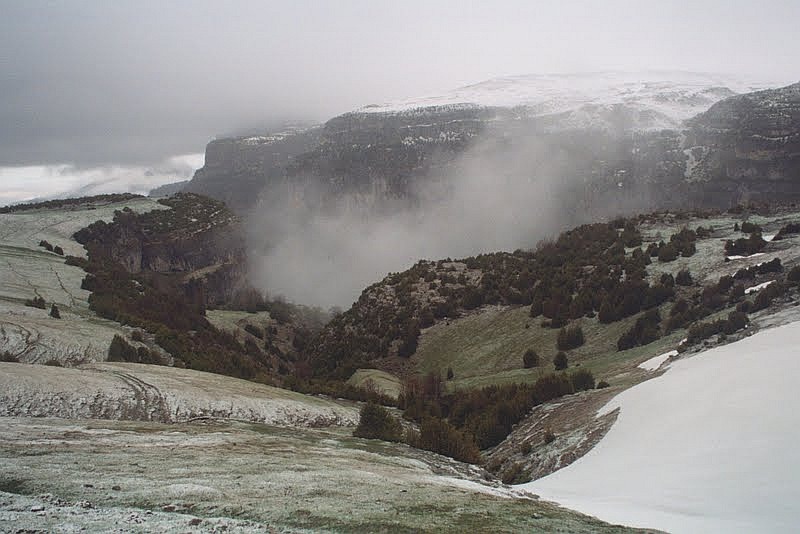 Zjechałyśmy piękną (ale dziurawą), drogą wzdłuż rzeki .  Korzystając z tego, że Asia jechała do tunelu podjechałam z nią aż do Bielsy. W międzyczasie zaczęło lać. Wyskoczyłam, nakryłam się byle jak peleryną i poleciałam do miasta. Asia musiała się już śpieszyć- tunel zamykają na noc. Miałam zamiar się przespać w hostelu na rynku, ale kosztował 35 Euro! Tak drogiego nie  widziałam nawet w żadnym z wielkich miast. Szybko zrobiłam zakupy (następnego dnia było święto- 1 maja, a moje jedzenie kończyło się), a potem pobiegłam na kemping mając nadzieję, że tam coś mają. Mój worek biwakowy nie bardzo się nadawał do spania w taki deszcz, do najbliższego schroniska (Pineta) było kilkanaście kilometrów… ściemniało się… Na kempingu Bielsa, o czym nie wiedziałam, jest hotel. Dostałam w nim piękny pokój z łazienką za 25 Euro. Hotel był zamknięty, ale pan w recepcji- miły. Albo ja wyglądałam tak wariacko, że nie odmówił (w pośpiechu założyłam pelerynę na kapelusz od słońca. Dobry patent, bo wtedy kaptur peleryny nie spada na nos (zawiesza się na rondzie), ale wygląda to na pewno głupio :)). Hotel piękny. Brak ogrzewania mi nie przeszkadzał. Miałam puchowy śpiwór… a ciepłej wody było tam w bród. Dostałam też wrzątek do mojej kaszki :)