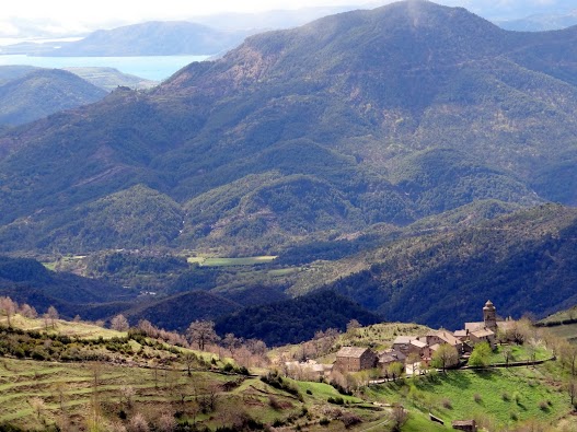 Przeczekałyśmy to pod łukowatą bramą koło kościoła, a potem poszłyśmy w dół. Nad Bestue szlak początkowo biegł drogą, a potem zeszedł na mokrą ścieżkę- płynął nią strumyk. Podobnie wyglądała dalsza trasa. Plątanina ścieżek łączących pola, czasem troszkę szersza stara droga dla mułów. Wszystko to bardzo skromnie oznakowane, a czasem oznakowane na ruchomych kamykach już mocno poprzestawianych przez krowy. Doszłyśmy tak aż do rzeki. Pogoda poprawiła się, ale rzeka bardzo wezbrała. Szlak wyglądał jakby wchodził do koryta, być może szedł w dół rzeki nad wodą. Nie dało się niestety iść wzdłuż brzegu. Nie było miejsca. Nie dało się też  przejść na drugi brzeg, to duża rzeka.  Trochę nas to przeraziło z Bestue do tego brodu było dość dużo zejścia. Słońce grzało. Zrobił się upał. Wcale nie miałyśmy zamiaru wracać!