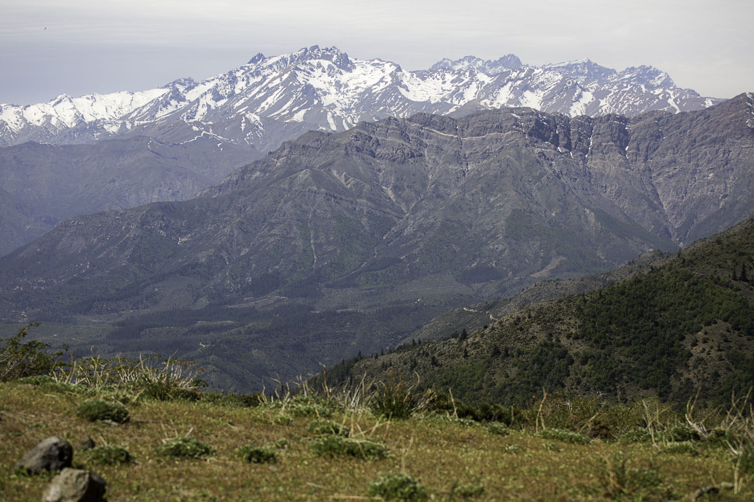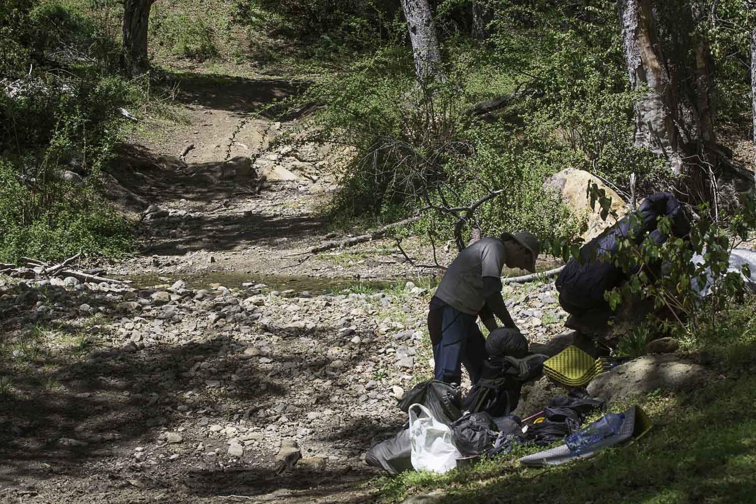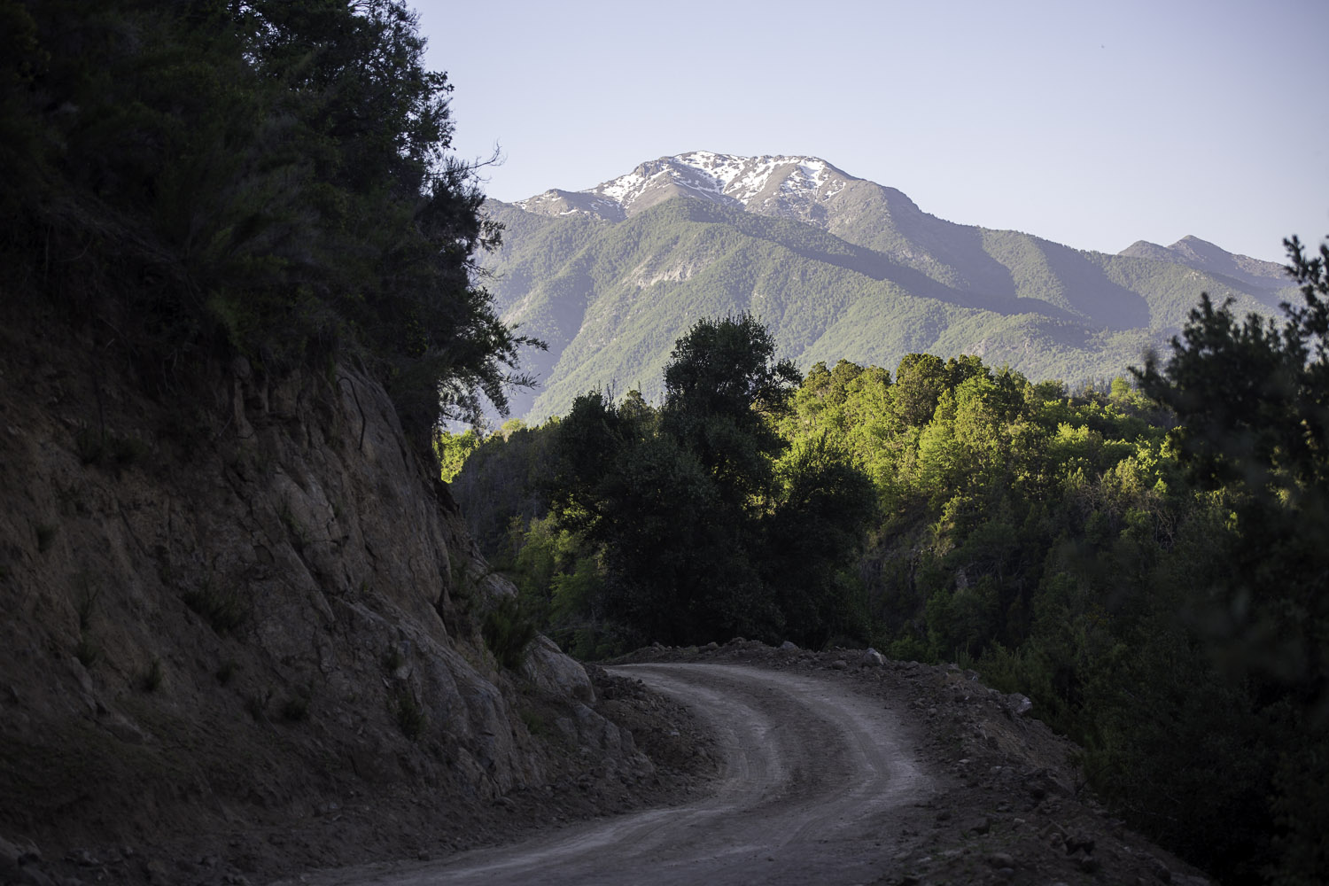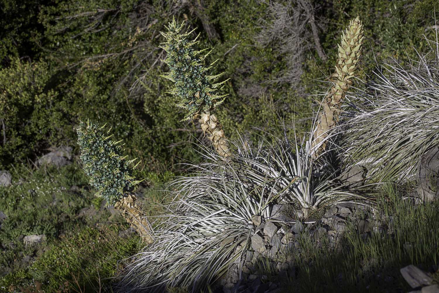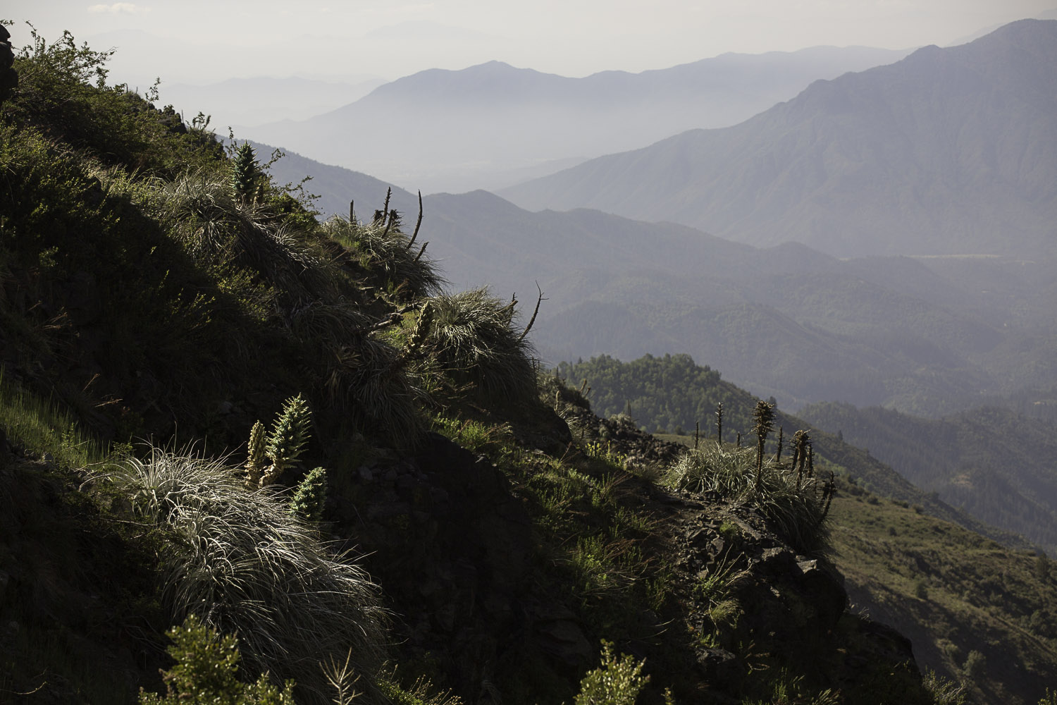 Próbuję trzymać się GPT, ale ślad na mapie prowadzi do czereśniowego sadu, ogrodzonego tak, że nie da się przejść. Zwały drewna, kolczasty drut. Wybieram jakiś inny wariant już bez szlaku. To taka sama gruntowa pylista droga. Na szczęście nikt tu nie jedzie. Podchodzimy lasem, krzakami, droga robi się coraz cieńsza i wyżej zwęża się do konnej ścieżki. Ponad lasem wynurza się wspaniały widok. Południowe zbocza Andów są całe białe. Siadamy przy jeszcze pustych szałasach, filtrujemy na zapas wodę. Jest wcześnie, ale dopada mnie senność, chciałabym zostać w tym pięknym płaskim miejscu, ze wspaniałym widokiem. Jednak zmuszam się i ruszam dalej. Jose wcale nie jest zmęczony. Podchodzimy jeszcze kilka kilometrów, mijamy zarośnięty wąwóz z wartkim potokiem. Na wysokich wiechach puya alpestris otwierają się właśnie pierwsze kwiatki. Ich turkusowy kolor (tak jak poprzednio) wydaje mi się nieprawdziwy. Plastikowy. Zostajemy na wypłaszczeniu z kępami kolczastych krzewinek. Ziemia jest pełna króliczych nor i krowich placków. Dobrze, że nabraliśmy wody w potoku.