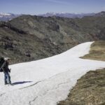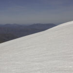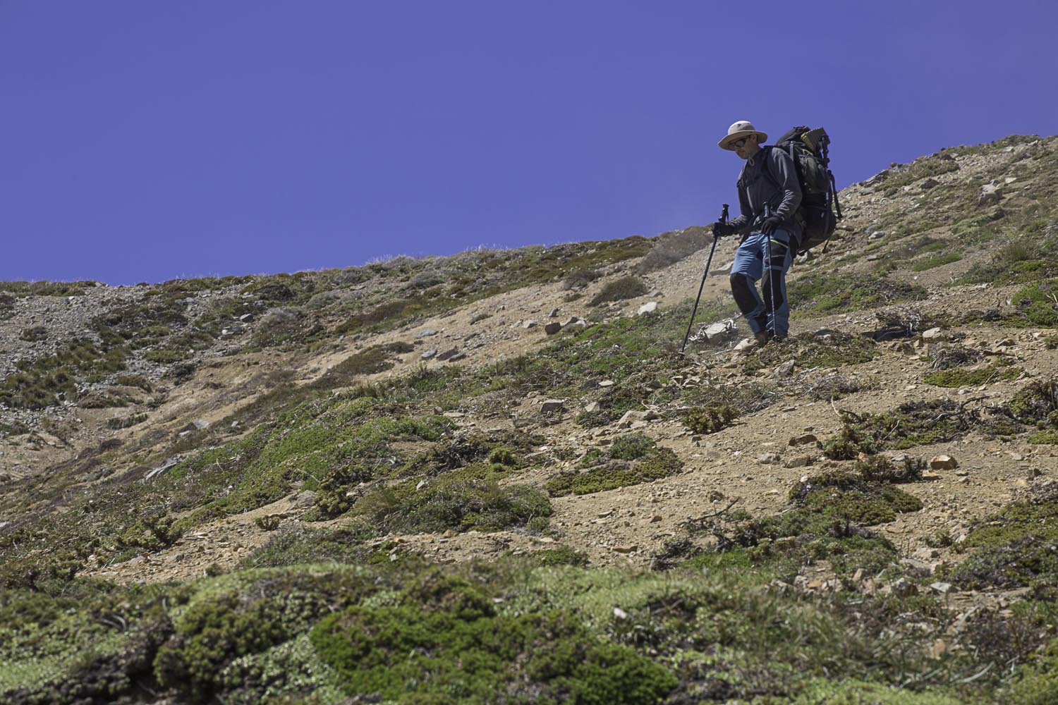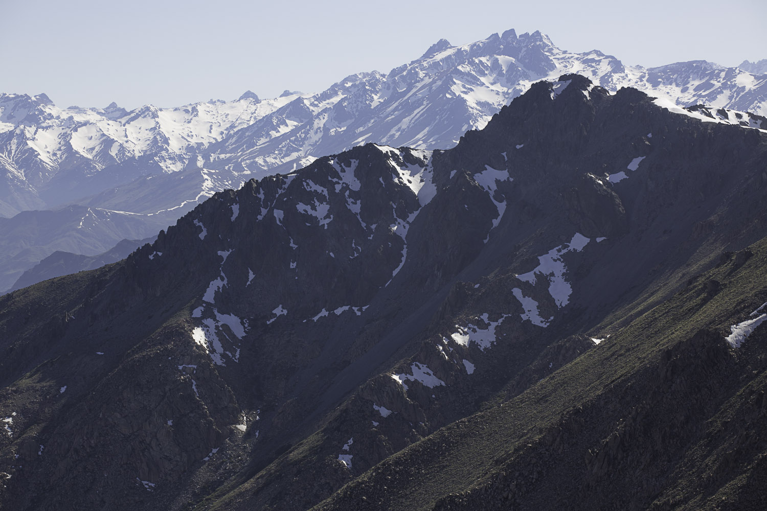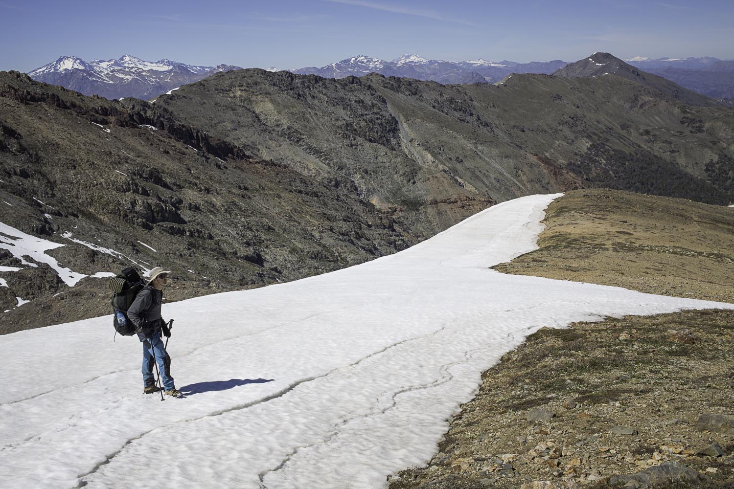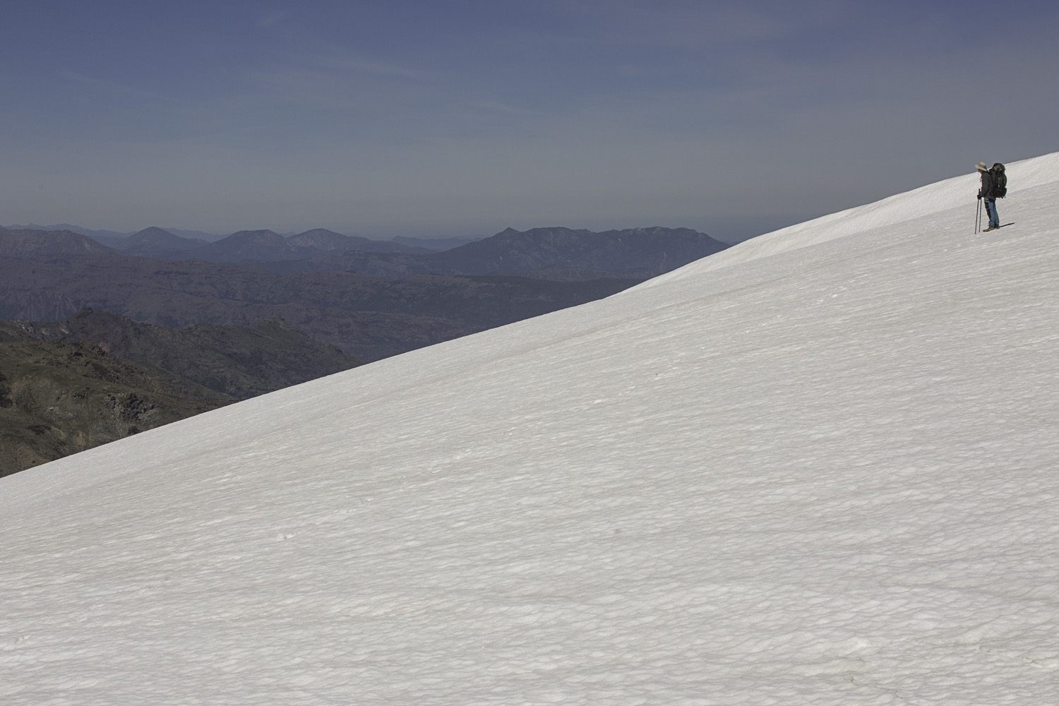 Do przełęczy zostało 500 metrów podejścia. Stok jest suchy, pylisty i gładki nic nie zapowiada zwałów śniegu, które zaległy po drugiej stronie. Z grani zwisają ogromne nawisy. Skaliste zbocze opada bardzo stromo. Jose schodzi niżej, zerka czy da się stąd zejść, ale stromizna jest tak duża, że znika widok w dół. Na skale wypisano imiona ludzi, którzy tu zginęli. Nie widać stawu Laguna Fria. Nie bardzo rozumiem jak powinniśmy dalej pójść, szlak schodzi i wchodzi, próbuję to ominąć granią, ale nadal jest zbyt dużo śniegu i zbyt stromo. Od Laguna Fria opada linia wyrytej w stoku drogi, której nie ma na mojej mapie. Podobnie w drugiej dolinie. To wydrukowałam sobie z google earth. Zawijasy znikają w lesie. „Drogi prowadzą do ludzi” myślę jak zawsze i próbujemy tam zejść. Stok jest bardzo stromy, ale suchy, bez śniegu i urwistych skał. Kiedy się obsuwamy ostrożnie, zygzakami lata nad nami kondor.