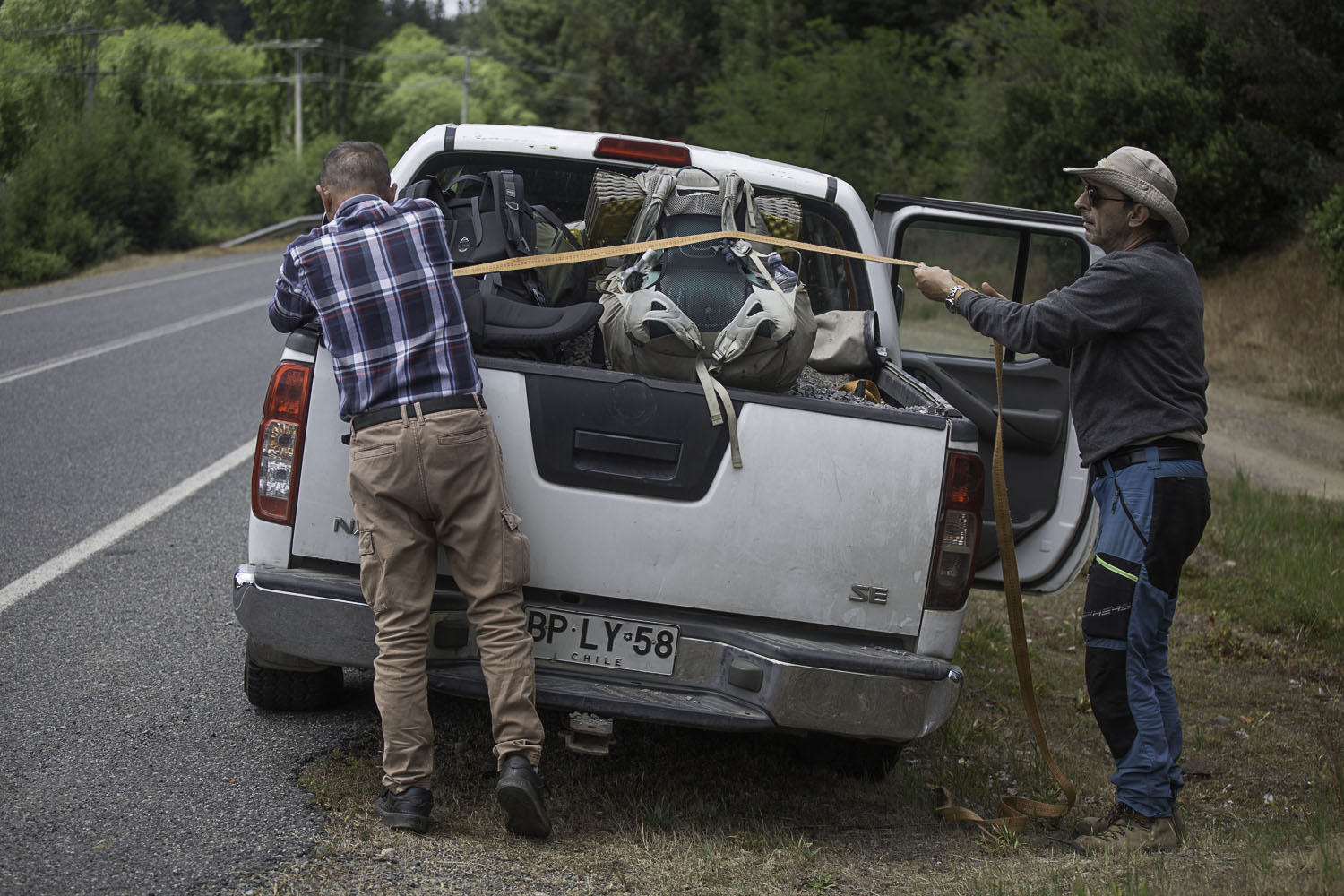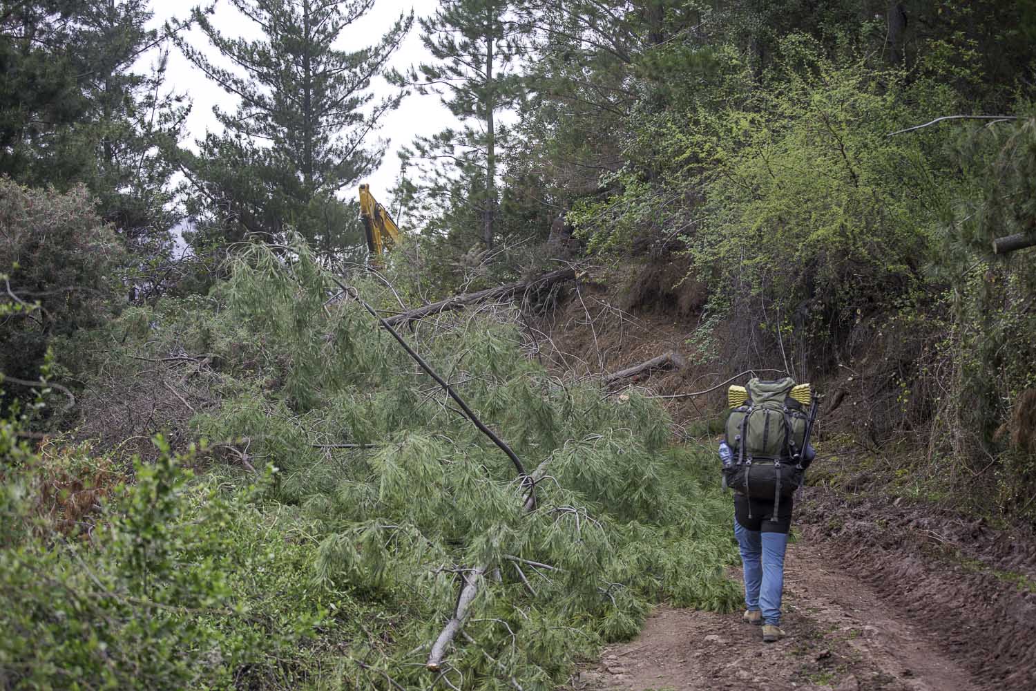 Kolejny dzień jest w całości pomyłką. Droga, którą wypatrzyłam w google earth prowadzi do plantacji sosen. W lesie pracują mężczyźni, zwalają się kolejne pnie. Czekamy, ale mówią, że się nie da, że drzewa zasiały się i pozarastały wszystko tak, że i oni się nie przebili. Siąpi, zawracamy nie wiedząc co robić i zaczepia nas starszy mężczyzna. Z tej samej ekipy. -Tędy też da się dojść na Cerro Pelado- tłumaczy- Idźcie do końca drogi i potem w górę.
