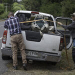 15 kilometrów dalej nasza sytuacja się wcale nie zmienia. Wprawdzie jesteśmy na jakiejś drodze, czasem widać odbity ślad kół, ale nie mamy pojęcia dokąd to zmierza. Zakręt za zakrętem, mijamy wąwozy i grzbiety i wcale się nie zbliżamy do szosy. – Słyszysz?- pyta Jose i za moment ja też słyszę warkot motoru. Za kolejnym potokiem w lesie pracuje koparka.